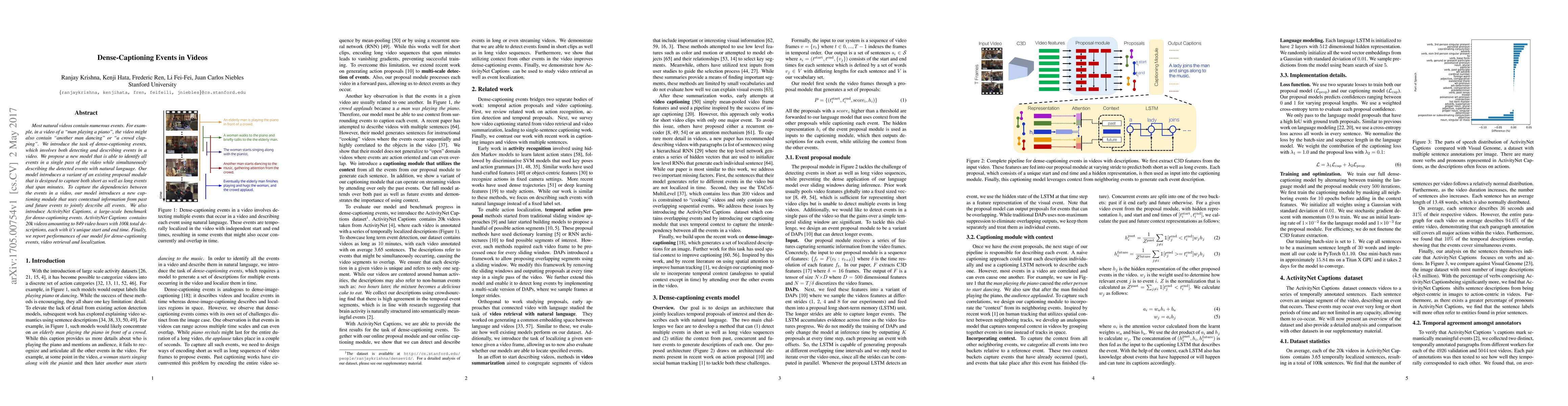 This paper proposes a model for dense-captioning events in videos, capable of detecting and describing multiple events simultaneously. It introduces a new benchmark dataset, ActivityNet Captions, and reports the model's performance on dense-captioning, video retrieval, and localization.