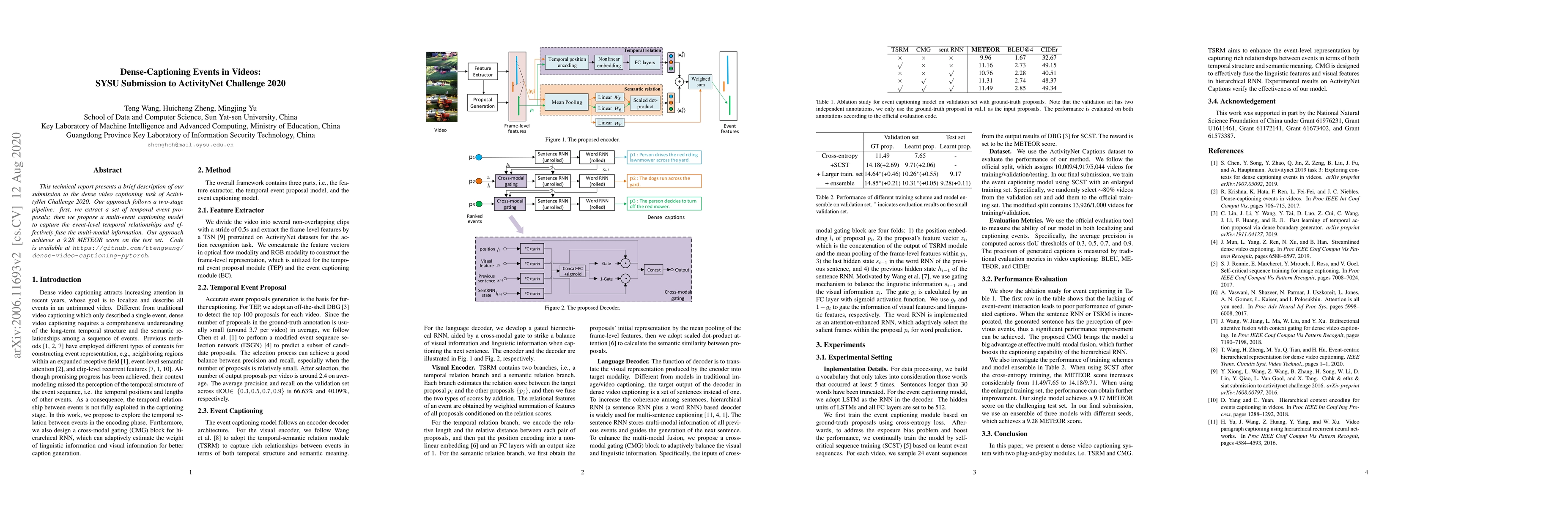 This paper describes a two-stage method for dense video captioning in the ActivityNet Challenge 2020, using temporal event proposals and a multi-event captioning model to capture event-level relationships, achieving a METEOR score of 9.28.