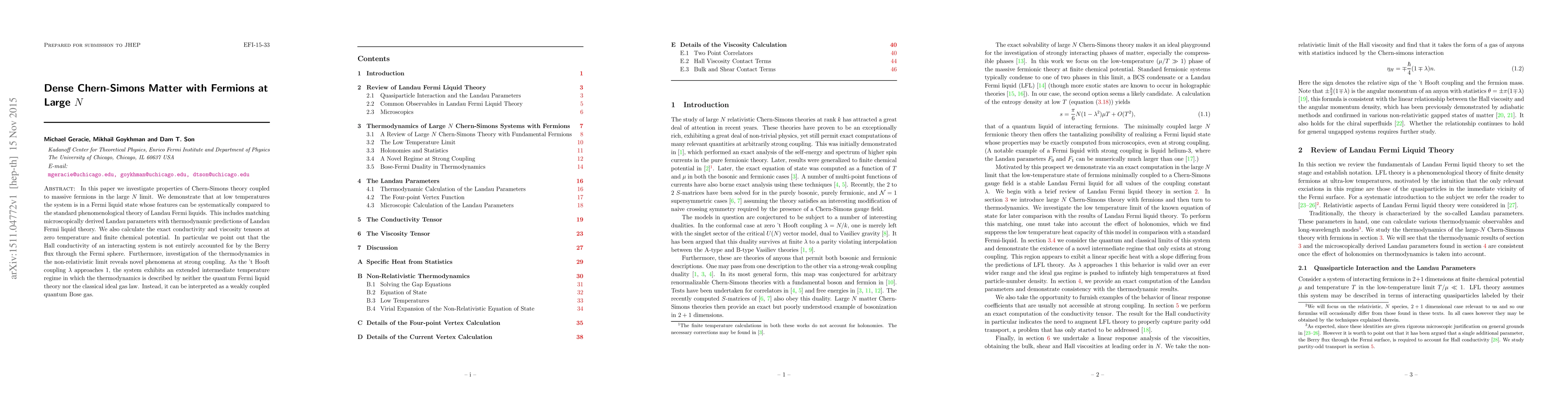 This paper explores Chern-Simons theory coupled to massive fermions in the large N limit, demonstrating that the system forms a Fermi liquid state at low temperatures. It also reveals novel thermodynamic phenomena at strong coupling, including an intermediate temperature regime described by a weakly coupled quantum Bose gas.