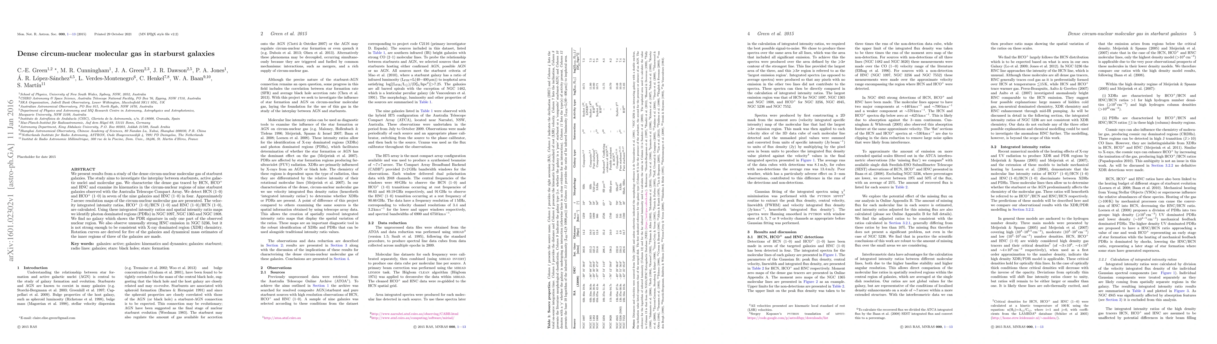 This study investigates the dense circum-nuclear molecular gas in starburst galaxies, focusing on the HCN, HCO$^+$, and HNC emissions. The research identifies photon dominated regions (PDRs) in three galaxies and provides evidence of strong HNC emission in NGC 5236, while also deriving rotation curves and dynamical mass estimates for several galaxies.