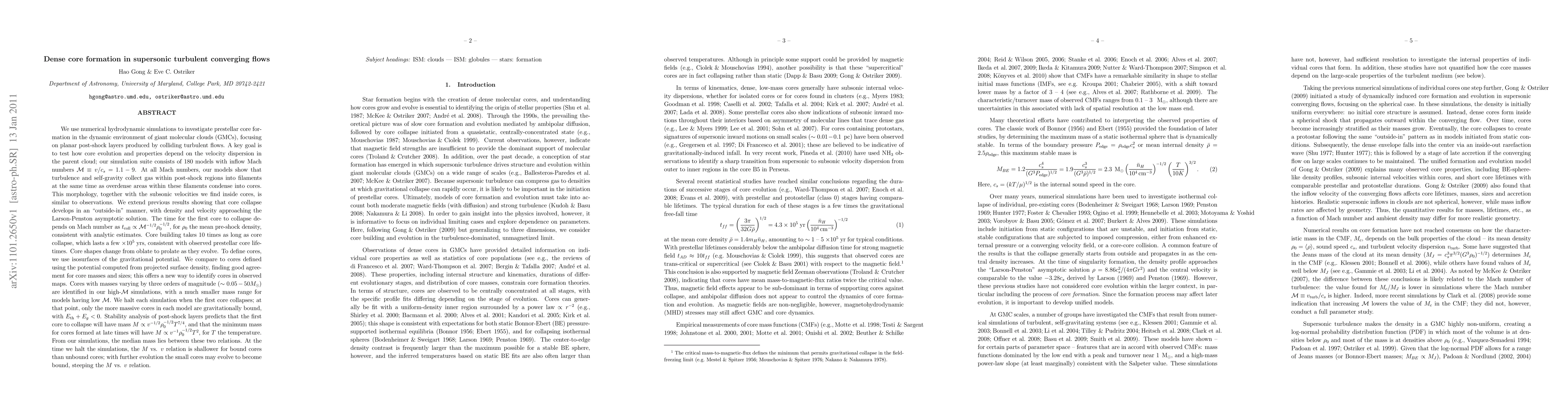 We use numerical hydrodynamic simulations to investigate prestellar core formation in the dynamic environment of giant molecular clouds, focusing on planar post-shock layers produced by colliding turbulent flows. A key goal is to test how core evolution and properties depend on the velocity dispersion in the parent cloud; our simulation suite consists of 180 models with inflow Mach numbers Ma=v/c_s=1.1-9. At all Mach numbers, our models show that turbulence and self-gravity collect gas within post-shock regions into filaments at the same time as overdense areas within these filaments condense into cores. This morphology, together with the subsonic velocities we find inside cores, is similar to observations. We extend previous results showing that core collapse develops in an ``outside-in'' manner, with density and velocity approaching the Larson-Penston asymptotic solution. The time for the first core to collapse varies as 1/sqrt(v), consistent with analytic estimates. Core building takes 10 times as long as core collapse, consistent with observed prestellar core lifetimes. Core shapes change from oblate to prolate as they evolve. To define cores, we use isosurfaces of the gravitational potential. We compare to cores defined using the potential computed from projected surface density, finding good agreement for core masses and sizes; this offers a new way to identify cores in observed maps. Cores with masses varying by three orders of magnitude (0.05 - 50 M_sun) are identified in our simulations. Stability analysis of post-shock layers predicts that the first core to collapse will have mass M \propto v^-1/2, and that the minimum mass for cores formed at late times will have M\propto v^-1. From our simulations, the median mass lies between these two relations.