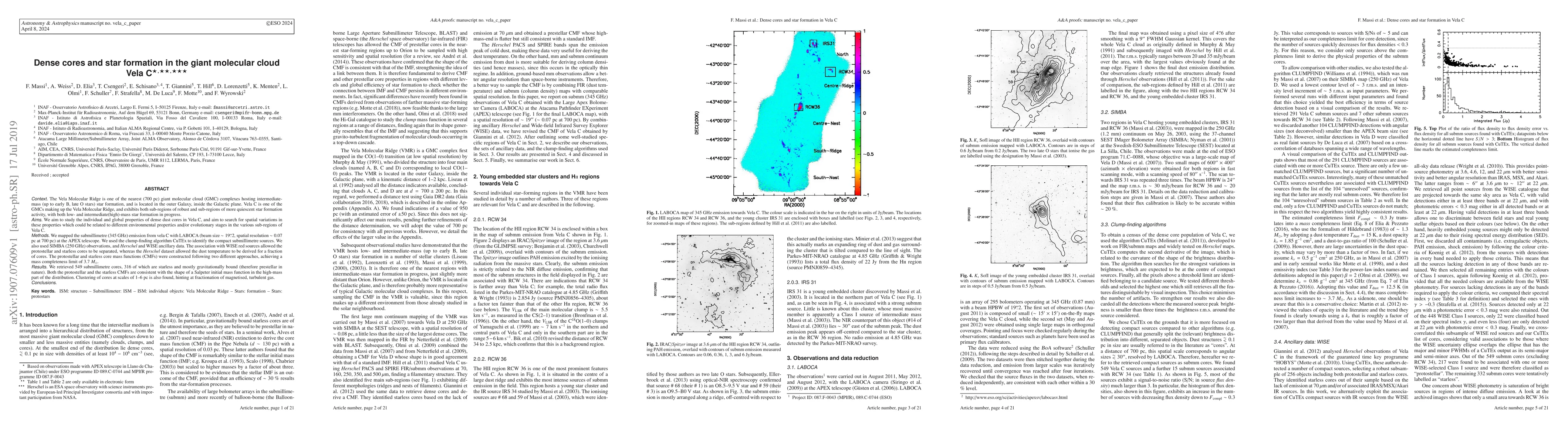 Context The Vela Molecular Ridge is one of the nearest (700 pc) giant molecular cloud (GMC) complexes hosting intermediate-mass (up to early B, late O stars) star formation, and is located in the outer Galaxy, inside the Galactic plane. Vela C is one of the GMCs making up the Vela Molecular Ridge, and exhibits both sub-regions of robust and sub-regions of more quiescent star formation activity, with both low- and intermediate(high)-mass star formation in progress. Aims We aim to study the individual and global properties of dense dust cores in Vela C, and aim to search for spatial variations in these properties which could be related to different environmental properties and/or evolutionary stages in the various sub-regions of Vela C. Methods We mapped the submillimetre (345 GHz) emission from vela C with LABOCA (beam size 19.2", spatial resolution ~0.07 pc at 700 pc) at the APEX telescope. We used the clump-finding algorithm CuTEx to identify the compact submillimetre sources. We also used SIMBA (250 GHz) observations, and Herschel and WISE ancillary data. The association with WISE red sources allowed the protostellar and starless cores to be separated, whereas the Herschel dataset allowed the dust temperature to be derived for a fraction of cores. The protostellar and starless core mass functions (CMFs) were constructed following two different approaches, achieving a mass completeness limit of 3.7 Msun. Results We retrieved 549 submillimetre cores, 316 of which are starless and mostly gravitationally bound (therefore prestellar in nature). Both the protostellar and the starless CMFs are consistent with the shape of a Salpeter initial mass function in the high-mass part of the distribution. Clustering of cores at scales of 1--6 pc is also found, hinting at fractionation of magnetised, turbulent gas.