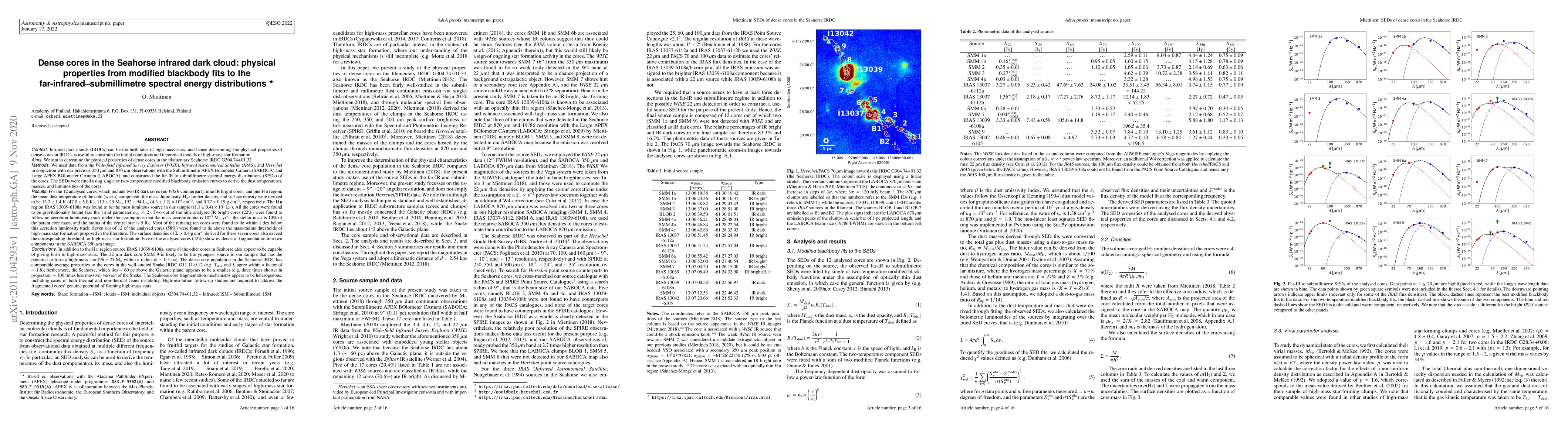 We used data from WISE, IRAS, and Herschel in conjuction with our previous observations with SABOCA and LABOCA, and constructed the far-IR to submillimetre spectral energy distributions (SEDs) of dense cores in the filamentary Seahorse infrared dark cloud (IRDC) G304.74+01.32. For the 12 analysed cores, which include two IR dark cores (no WISE counterpart), nine IR bright cores, and one HII region, the mean dust temperature of the cold (warm) component, the mass, luminosity, H$_2$ number density, and surface density were derived to be $13.3\pm1.4$ K ($47.0\pm5.0$ K), $113\pm29$ M$_{\odot}$, $192\pm94$ L$_{\odot}$, $(4.3\pm1.2)\times10^5$ cm$^{-3}$, and $0.77\pm0.19$ g cm$^{-3}$, respectively. The HII region IRAS 13039-6108a was found to be the most luminous source in our sample ($(1.1\pm0.4)\times10^3$ L$_{\odot}$). All the cores were found to be gravitationally bound (i.e. the virial parameter $\alpha_{\rm vir}<2$). Seven out of 12 of the analysed cores (58%) were found to lie above the mass-radius thresholds of high-mass star formation proposed in the literature. The surface densities of $\Sigma>0.4$ g cm$^{-3}$ derived for these seven cores also exceed the corresponding threshold for high-mass star formation. Five of the analysed cores (42%) show evidence of fragmentation into two components in the SABOCA 350 $\mu$m image. In addition to the HII region source IRAS 13039-6108a, some of the other cores in Seahorse also appear to be capable of giving birth to high-mass stars. The dense core population in the Seahorse IRDC has comparable average properties to the cores in the well-studied Snake IRDC G11.11-0.12. The Seahorse core fragmentation mechanisms appear to be heterogenous, including cases of both thermal and non-thermal Jeans instability. High-resolution follow-up studies are required to address the fragmented cores' genuine potential of forming high-mass stars.