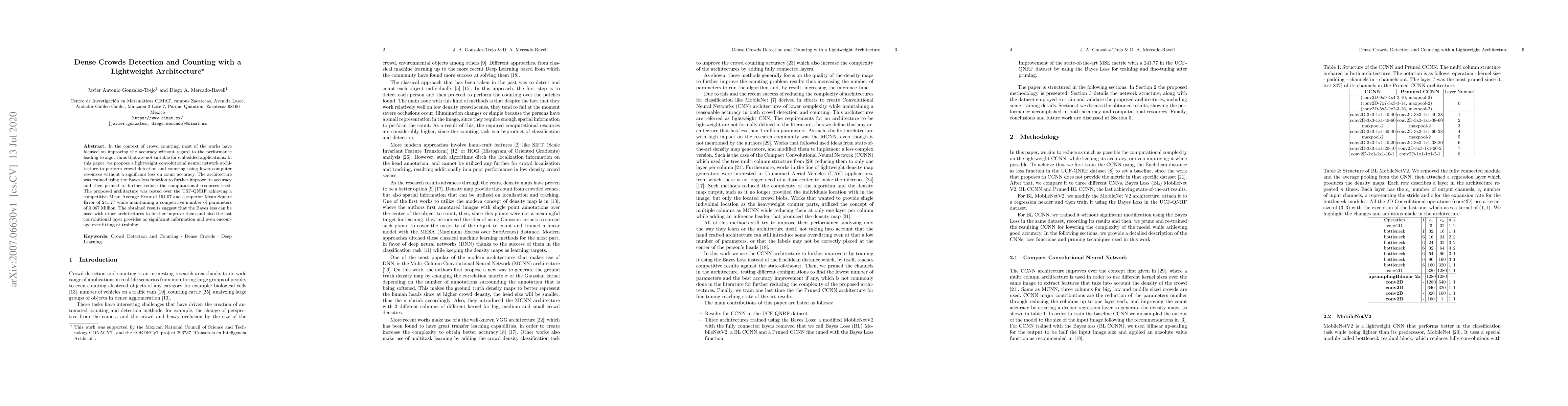 In the context of crowd counting, most of the works have focused on improving the accuracy without regard to the performance leading to algorithms that are not suitable for embedded applications. In this paper, we propose a lightweight convolutional neural network architecture to perform crowd detection and counting using fewer computer resources without a significant loss on count accuracy. The architecture was trained using the Bayes loss function to further improve its accuracy and then pruned to further reduce the computational resources used. The proposed architecture was tested over the USF-QNRF achieving a competitive Mean Average Error of 154.07 and a superior Mean Square Error of 241.77 while maintaining a competitive number of parameters of 0.067 Million. The obtained results suggest that the Bayes loss can be used with other architectures to further improve them and also the last convolutional layer provides no significant information and even encourage over-fitting at training.