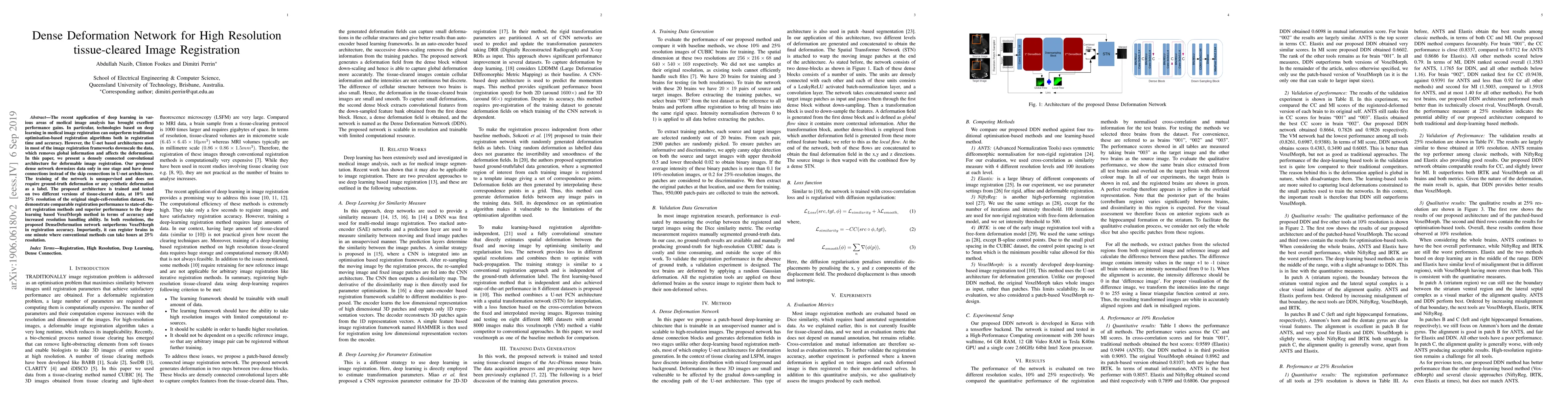 This paper introduces a densely connected convolutional network for high-resolution tissue cleared image registration, outperforming traditional methods in both accuracy and speed. Unlike U-net, the proposed DenseDeformation network maintains global information and achieves superior registration results, especially at lower resolutions.