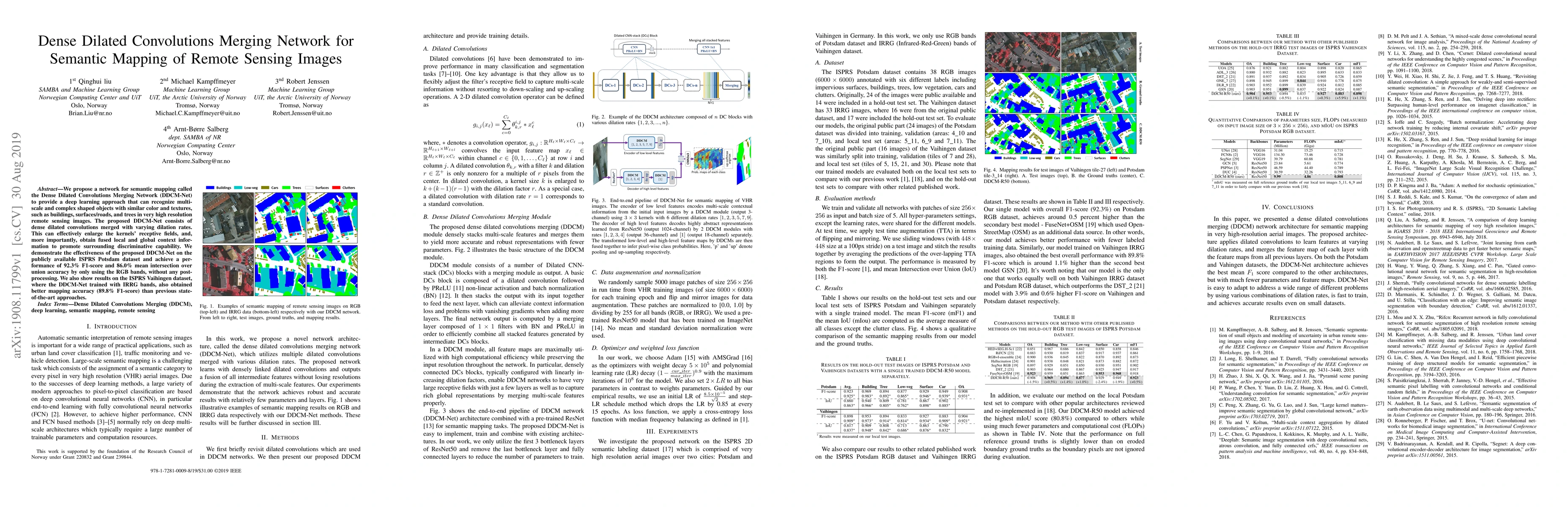 The paper proposes DDCM-Net, a deep learning network utilizing dense dilated convolutions to recognize multi-scale objects in high-resolution remote sensing images. The network achieves high accuracy on ISPRS datasets, demonstrating superior semantic mapping performance without post-processing.