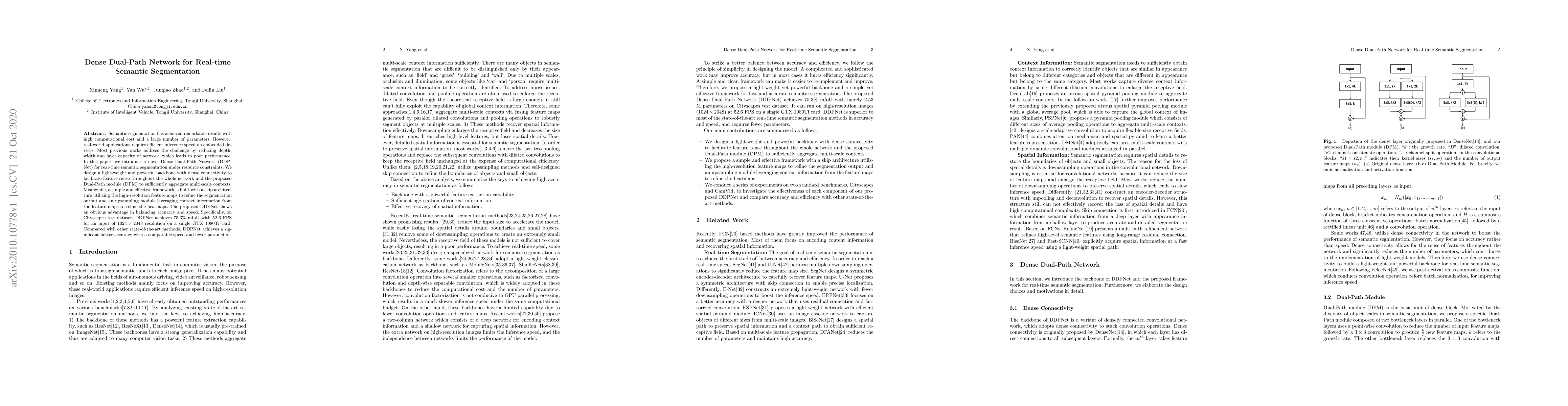 The paper proposes a Dense Dual-Path Network (DDPNet) for real-time semantic segmentation, balancing efficiency and accuracy by utilizing dense connectivity and a Dual-Path module for multi-scale context aggregation. DDPNet achieves 75.3% mIoU and 52.6 FPS on Cityscapes while maintaining fewer parameters compared to state-of-the-art methods.