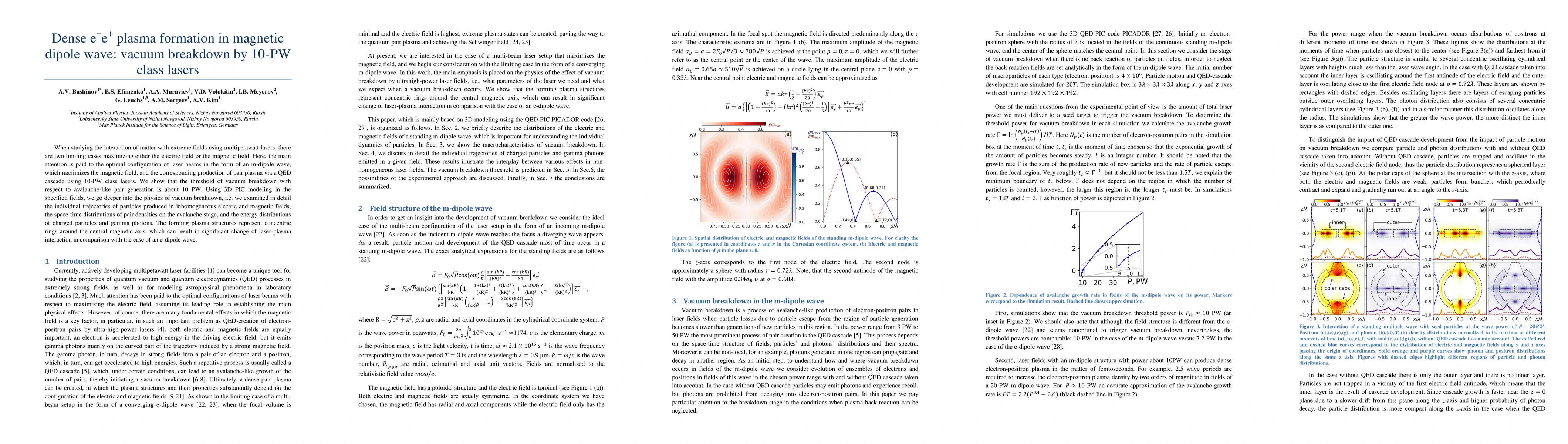 When studying the interaction of matter with extreme fields using multipetawatt lasers, there are two limiting cases maximizing either the electric field or the magnetic field. Here, the main attention is paid to the optimal configuration of laser beams in the form of an m-dipole wave, which maximizes the magnetic field, and the corresponding production of pair plasma via a QED cascade using 10-PW class lasers. We show that the threshold of vacuum breakdown with respect to avalanche-like pair generation is about 10 PW. Using 3D PIC modeling in the specified fields, we go deeper into the physics of vacuum breakdown, i.e. we examined in detail the individual trajectories of particles produced in inhomogeneous electric and magnetic fields, the space-time distributions of pair densities on the avalanche stage, and the energy distributions of charged particles and gamma photons. The forming plasma structures represent concentric rings around the central magnetic axis, which can result in significant change of laser-plasma interaction in comparison with the case of an e-dipole wave.
