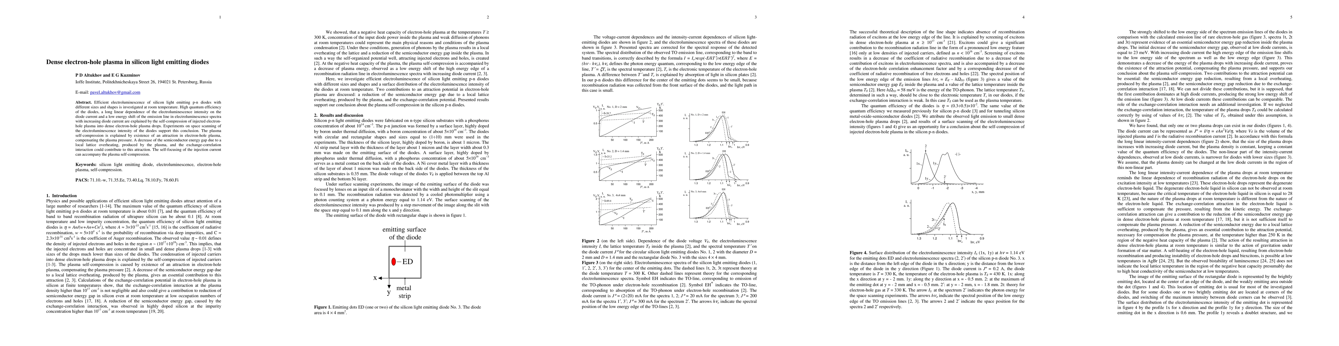 This paper investigates the efficient electroluminescence in silicon light emitting diodes, attributing high quantum efficiency and stable emission characteristics to the self-compression of injected electron-hole plasma into dense plasma drops, facilitated by an attractive force in the electron-hole plasma. Experimental results support the proposed mechanism of plasma self-compression.