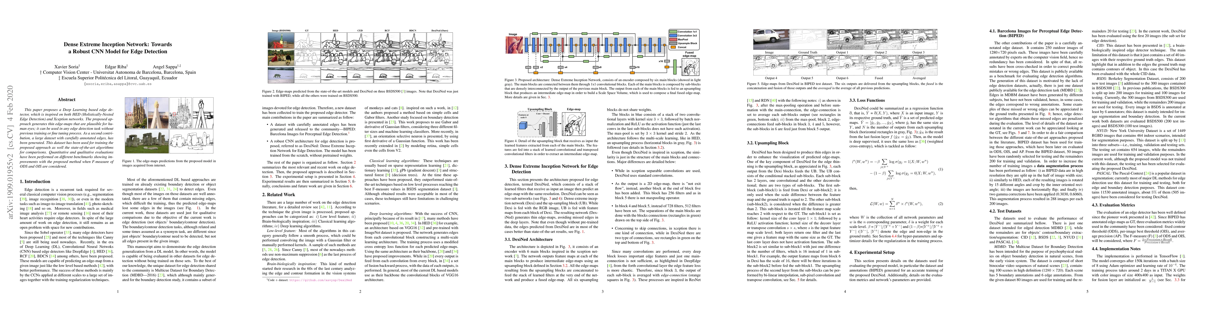 This paper proposes a Deep Learning based edge detector, which is inspired on both HED (Holistically-Nested Edge Detection) and Xception networks. The proposed approach generates thin edge-maps that are plausible for human eyes; it can be used in any edge detection task without previous training or fine tuning process. As a second contribution, a large dataset with carefully annotated edges has been generated. This dataset has been used for training the proposed approach as well the state-of-the-art algorithms for comparisons. Quantitative and qualitative evaluations have been performed on different benchmarks showing improvements with the proposed method when F-measure of ODS and OIS are considered.