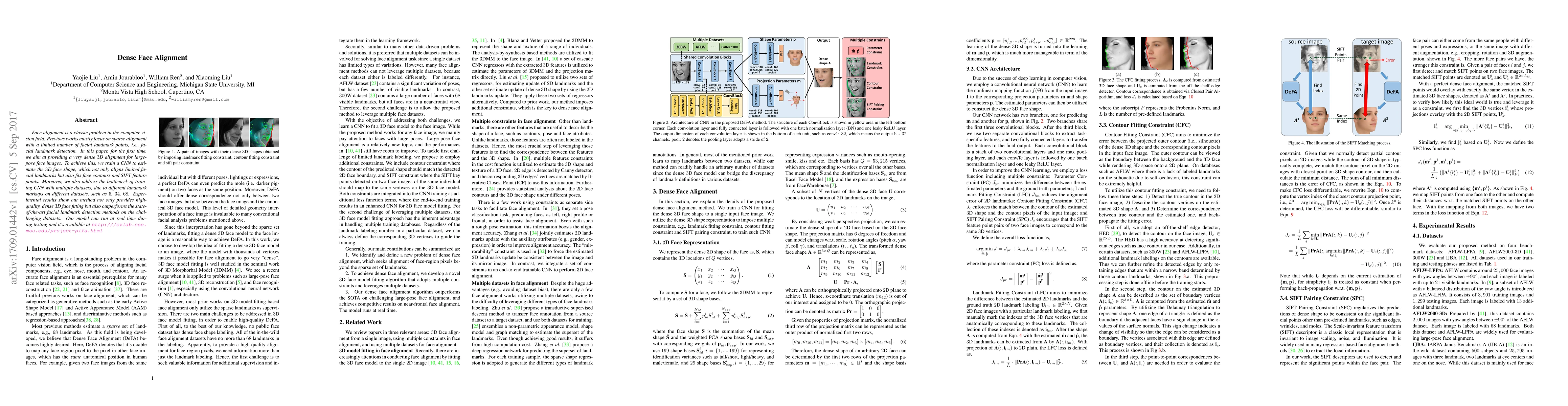 This paper introduces a CNN-based method for dense 3D face alignment, estimating 3D face shape and fitting contours and SIFT features, outperforming existing sparse landmark detection methods. The model addresses dataset heterogeneity issues and achieves real-time performance.