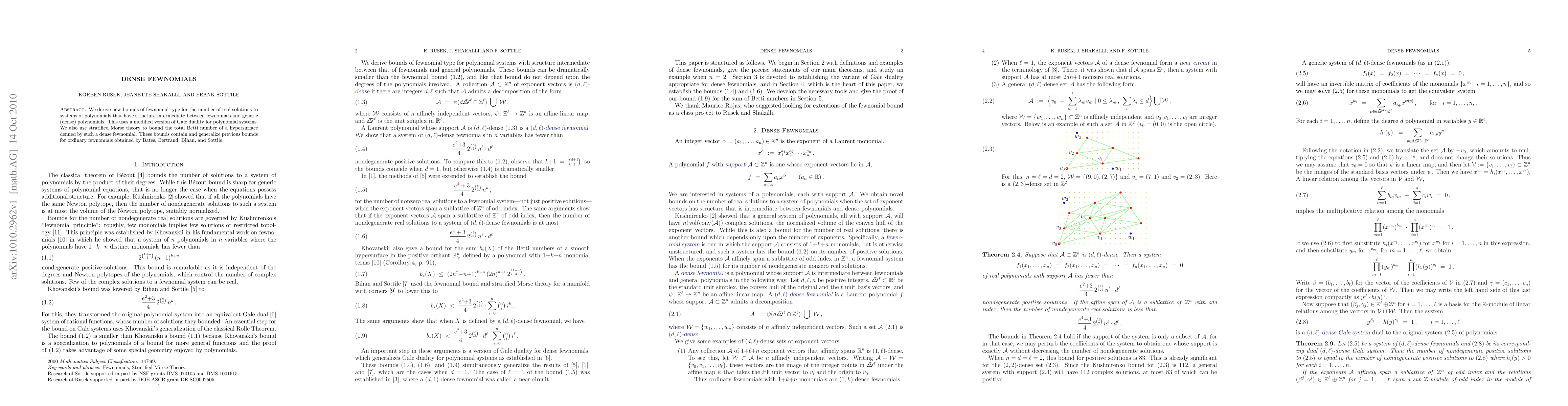 We derive new bounds of fewnomial type for the number of real solutions to systems of polynomials that have structure intermediate between fewnomials and generic (dense) polynomials. This uses a modified version of Gale duality for polynomial systems. We also use stratified Morse theory to bound the total Betti number of a hypersurface defined by such a dense fewnomial. These bounds contain and generalize previous bounds for ordinary fewnomials obtained by Bates, Bertrand, Bihan, and Sottile.