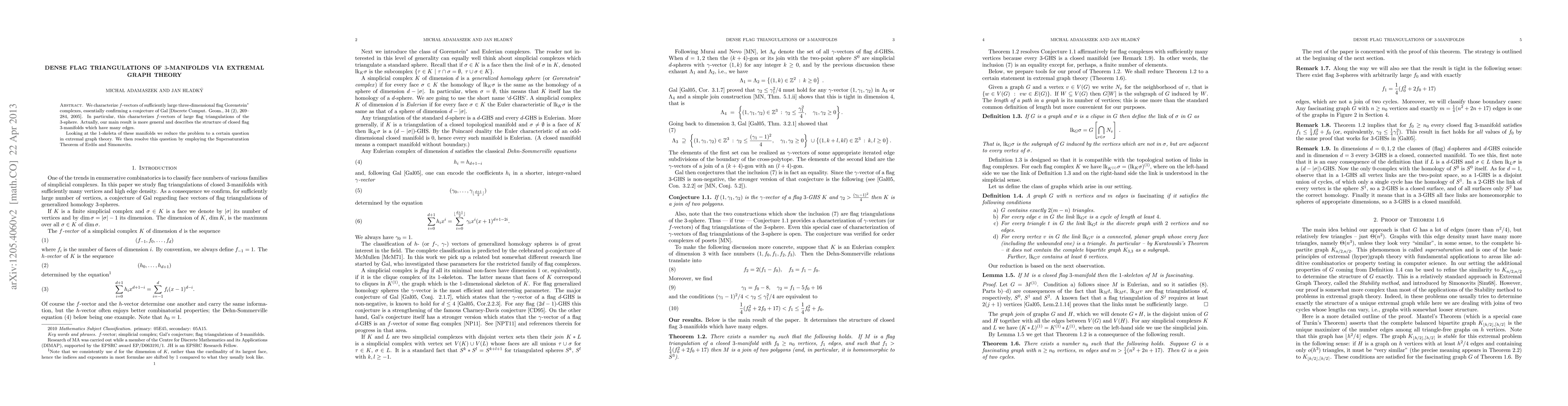 This paper characterizes the f-vectors of large three-dimensional flag Gorenstein complexes, confirming a conjecture by Gal, and describes the structure of closed flag 3-manifolds with many edges. The authors use extremal graph theory, specifically the Supersaturation Theorem, to resolve the underlying problem.