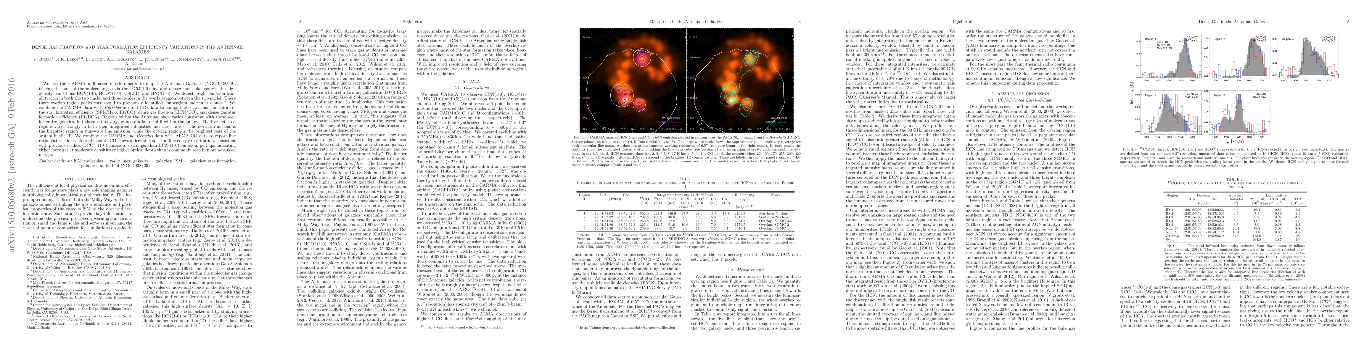 The Antennae Galaxies show variations in star formation efficiency and dense gas fraction across their nuclei and overlap region, with differences of up to a factor of 6.