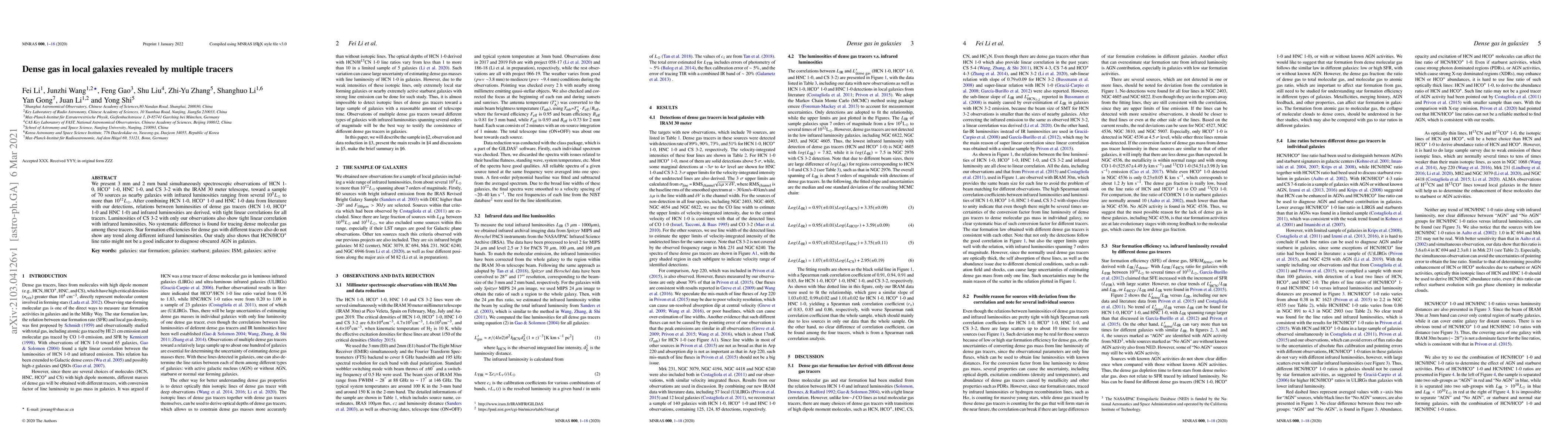 This paper uses IRAM telescope observations to study dense gas in nearby galaxies via multiple molecular tracers, finding tight linear correlations between infrared luminosities and dense gas tracers. It concludes that no systematic differences exist among tracers for dense gas, and HCN/HCO+ line ratios are not reliable for diagnosing obscured AGN.