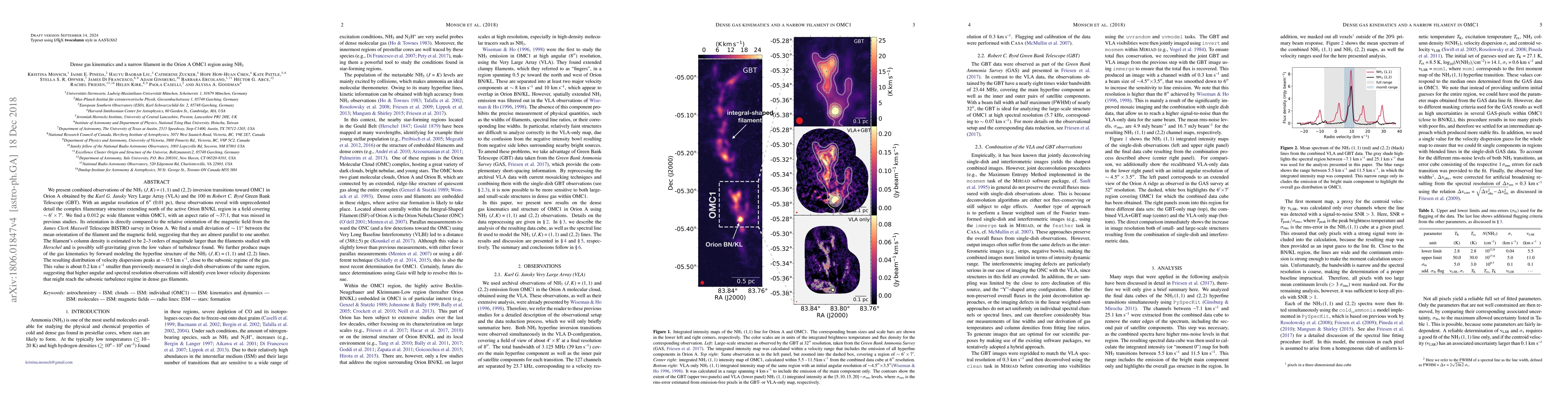 We present combined observations of the NH3 (J,K) = (1,1) and (2,2) inversion transitions towards OMC1 in Orion A obtained by the Karl G. Jansky Very Large Array (VLA) and the 100 m Robert C. Byrd Green Bank Telescope (GBT). With an angular resolution of 6" (0.01 pc), these observations reveal with unprecedented detail the complex filamentary structure extending north of the active Orion BN/KL region in a field covering 6' x 7'. We find a 0.012 pc wide filament within OMC1, with an aspect ratio of ~37:1, that was missed in previous studies. Its orientation is directly compared to the relative orientation of the magnetic field from the James Clerk Maxwell Telescope BISTRO survey in Orion A. We find a small deviation of ~11 deg between the mean orientation of the filament and the magnetic field, suggesting that they are almost parallel to one another. The filament's column density is estimated to be 2-3 orders of magnitude larger than the filaments studied with Herschel and is possibly self-gravitating given the low values of turbulence found. We further produce maps of the gas kinematics by forward modeling the hyperfine structure of the NH3 (J,K) = (1,1) and (2,2) lines. The resulting distribution of velocity dispersions peaks at ~0.5 km/s, close to the subsonic regime of the gas. This value is about 0.2 km/s smaller than previously measured in single-dish observations of the same region, suggesting that higher angular and spectral resolution observations will identify even lower velocity dispersions that might reach the subsonic turbulence regime in dense gas filaments.