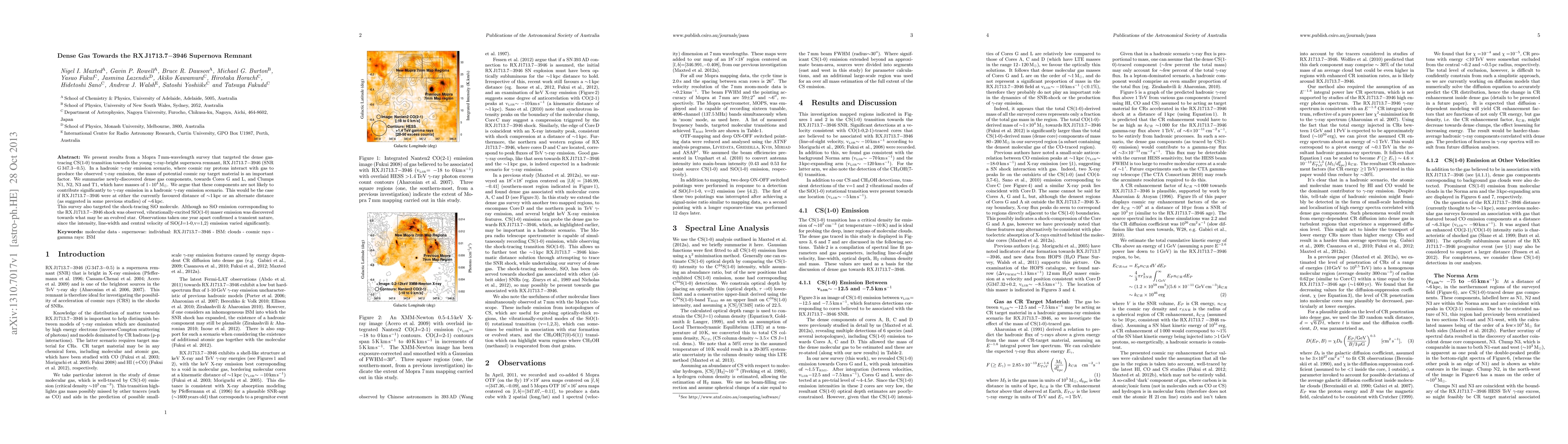 We present results from a Mopra 7mm-wavelength survey that targeted the dense gas-tracing CS(1-0) transition towards the young gamma-ray-bright supernova remnant, RXJ1713.7-3946 (SNR G347.3-0.5). In a hadronic gamma-ray emission scenario, where cosmic ray protons interact with gas to produce the observed gamma-ray emission, the mass of potential cosmic ray target material is an important factor. We summarise newly-discovered dense gas components, towards Cores G and L, and Clumps N1, N2, N3 and T1, which have masses of 1-10^4 solar masses. We argue that these components are not likely to contribute significantly to gamma-ray emission in a hadronic gamma-ray emission scenario. This would be the case if RXJ1713.7-3946 were at either the currently favoured distance of ~1kpc or an alternate distance (as suggested in some previous studies) of ~6kpc. This survey also targeted the shock-tracing SiO molecule. Although no SiO emission corresponding to the RXJ1713.7-3946 shock was observed, vibrationally-excited SiO(1-0) maser emission was discovered towards what may be an evolved star. Observations taken one year apart confirmed a transient nature, since the intensity, line-width and central velocity of SiO(J=1-0,v=1,2) emission varied significantly.
