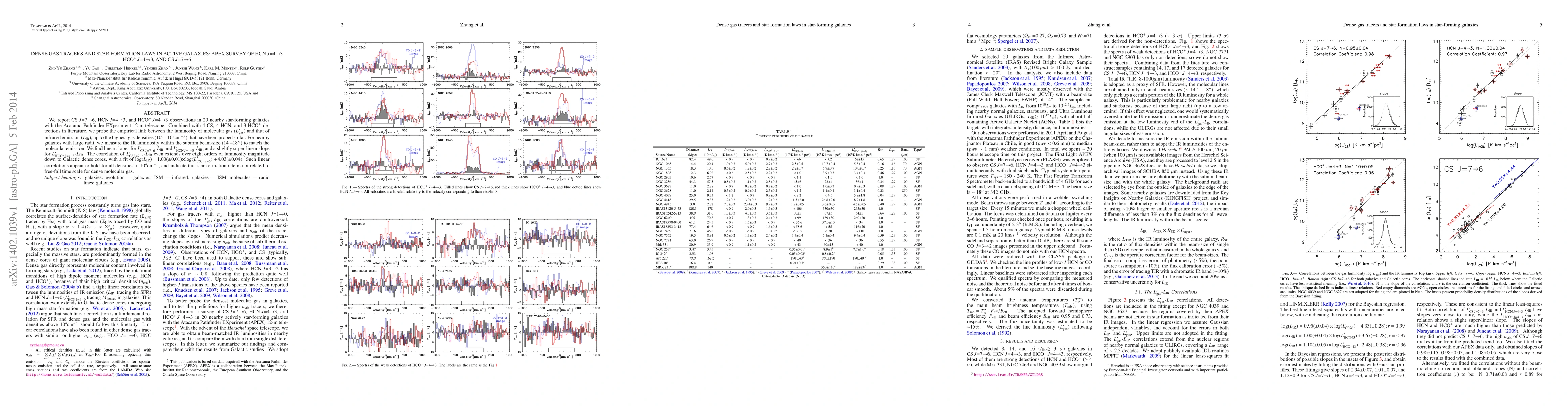 This study uses APEX telescope observations of HCN, HCO+, and CS lines in nearby star-forming galaxies to investigate the relationship between infrared luminosity (L_IR) and molecular gas luminosity (L_gas). The findings reveal linear correlations for L_CS76-L_IR and L_HCN43-L_IR, and a super-linear slope for L_HCO+43-L_IR, suggesting star formation rate is not dependent on the dense gas's free-fall time scale.