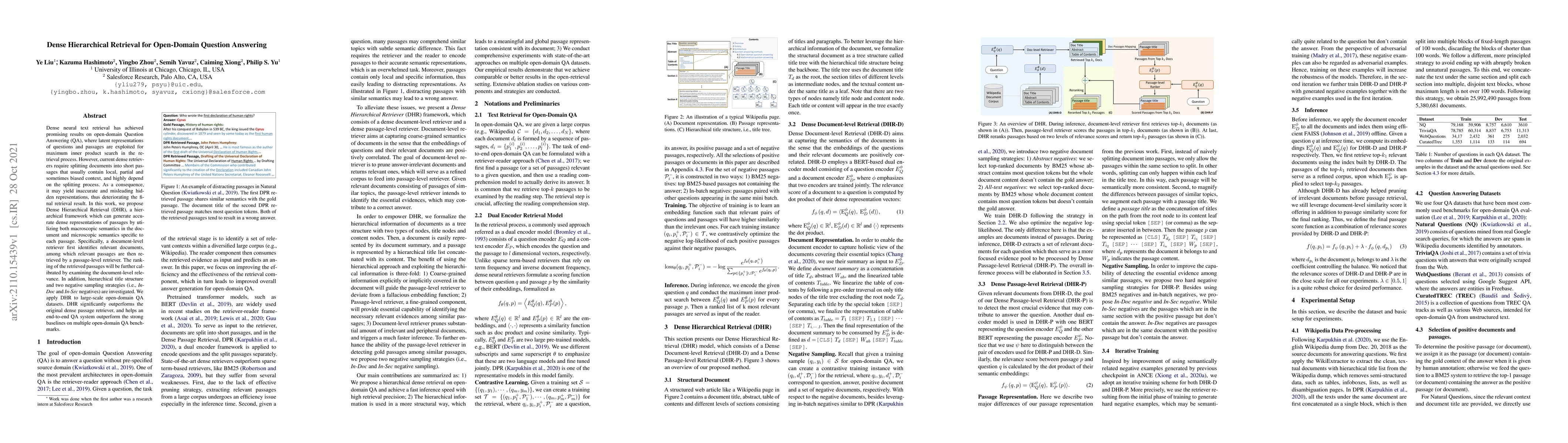 This paper proposes Dense Hierarchical Retrieval (DHR), a framework that improves open-domain Question Answering by generating accurate dense representations using both document-level and passage-level retrievers. DHR outperforms traditional dense retrievers and enhances overall QA system performance on multiple benchmarks.