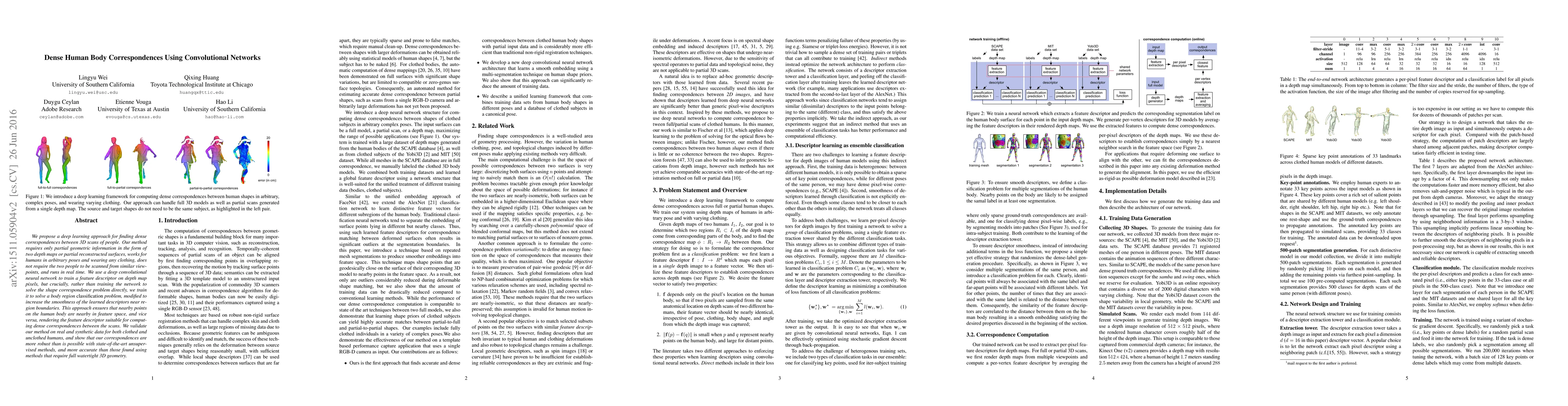 This paper presents a deep learning approach using convolutional networks to find dense correspondences between 3D scans of humans, requiring only partial geometric information and working in real time. The method trains a feature descriptor on depth maps to solve a body region classification problem, ensuring robust and accurate correspondences for humans in various poses and clothing.