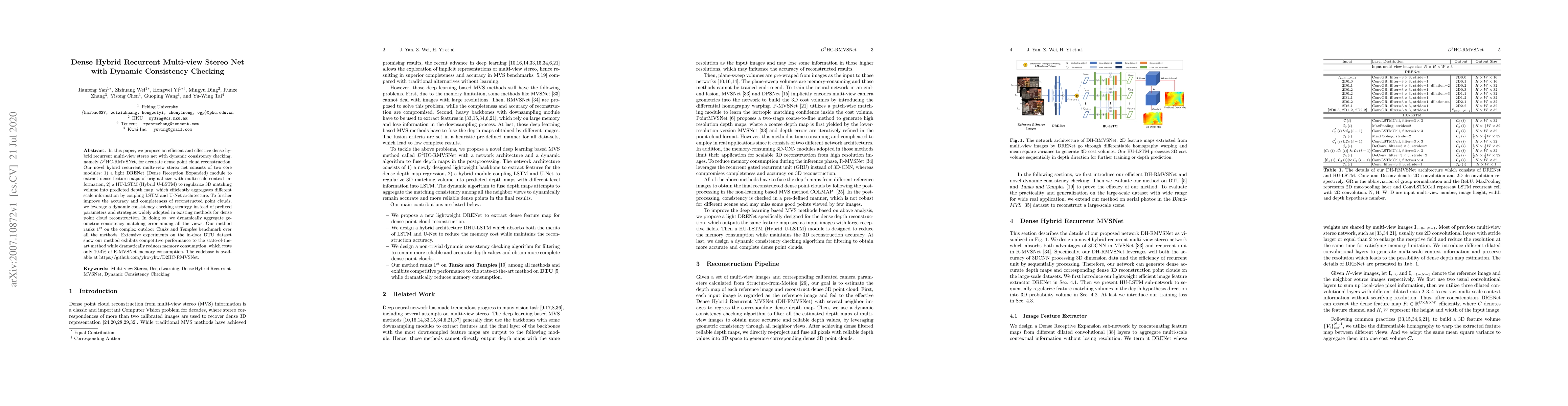 This paper introduces $D^{2}$HC-RMVSNet, a dense hybrid recurrent multi-view stereo network with dynamic consistency checking for precise dense point cloud reconstruction. It employs a DRENet module for multi-scale context feature extraction and a HU-LSTM for depth map prediction, achieving top performance on the Tanks and Temples benchmark while significantly reducing memory usage.