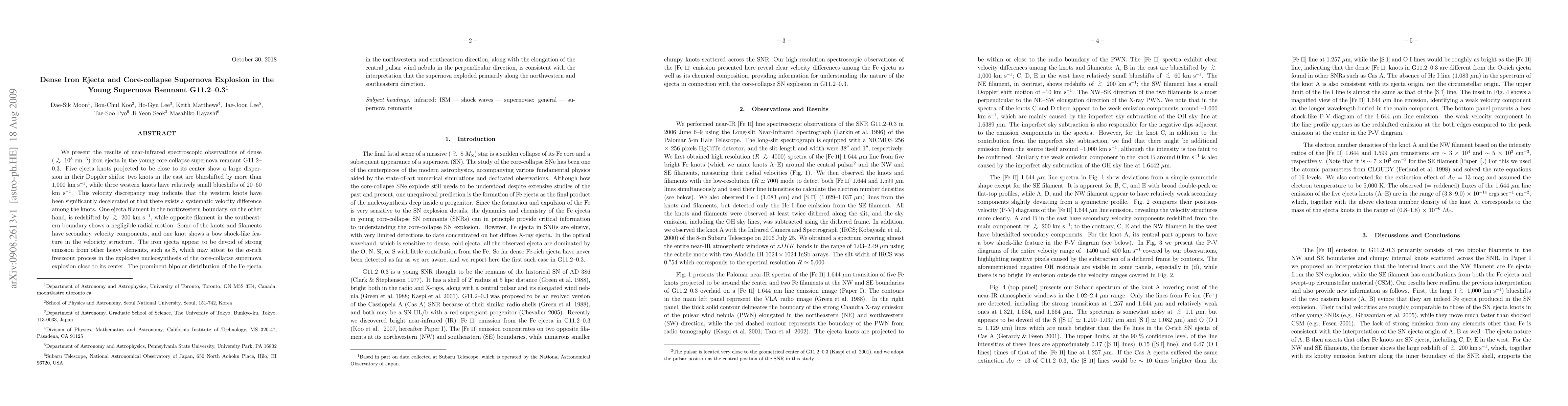 This paper reports on near-infrared spectroscopic observations of dense iron ejecta in the young core-collapse supernova remnant G11.2-0.3, revealing significant velocity discrepancies among ejecta knots, suggesting deceleration or systematic differences. The findings support a bipolar explosion model, with prominent iron ejecta distribution along the northwestern and southeastern directions.