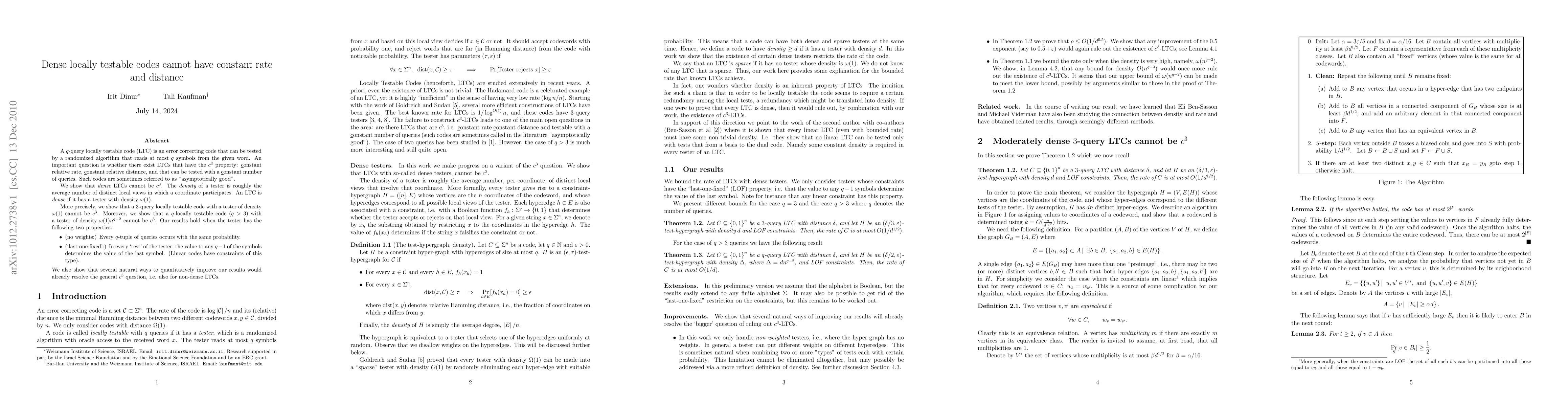 A q-query locally testable code (LTC) is an error correcting code that can be tested by a randomized algorithm that reads at most q symbols from the given word. An important question is whether there exist LTCs that have the ccc-property: constant relative rate, constant relative distance, and that can be tested with a constant number of queries. Such codes are sometimes referred to as "asymptotically good". We show that dense LTCs cannot be ccc. The density of a tester is roughly the average number of distinct local views in which a coordinate participates. An LTC is dense if it has a tester with density >> 1. More precisely, we show that a 3-query locally testable code with a tester of density >> 1 cannot be ccc. Moreover, we show that a q-query locally testable code (q>3) with a tester of density >> n^{q-2} cannot be ccc. Our results hold when the tester has the following two properties: 1) "no weights": Every q-tuple of queries occurs with the same probability. 2) "last-one-fixed": In every `test' of the tester, the value to any q-1 of the symbols determines the value of the last symbol. (Linear codes have constraints of this type). We also show that several natural ways to quantitatively improve our results would already resolve the general ccc-question, i.e. also for non-dense LTCs.