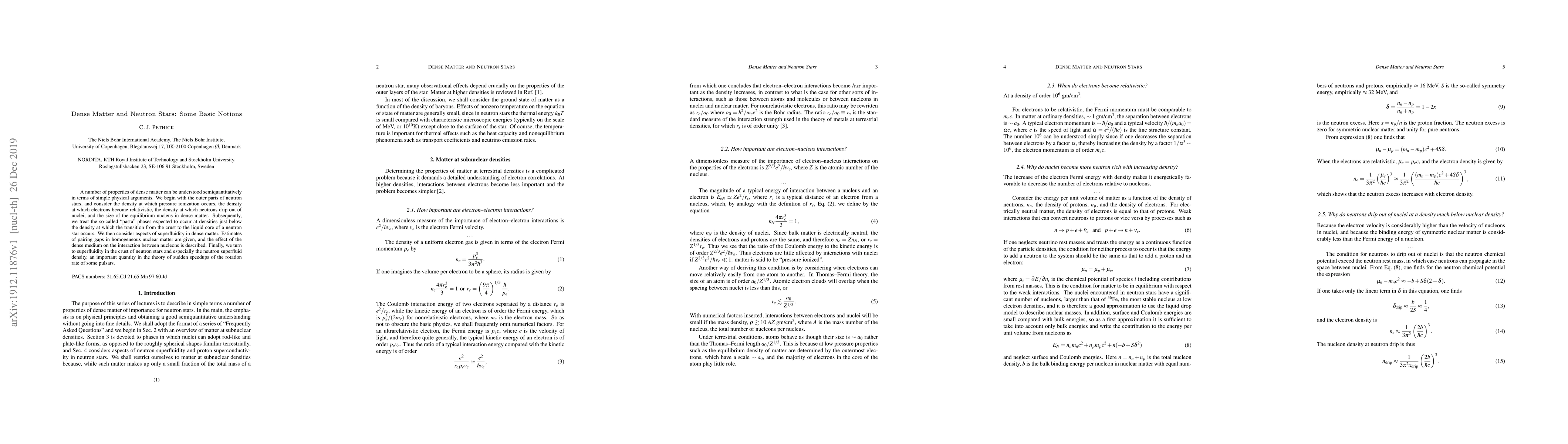 This paper explores fundamental properties of dense matter within neutron stars, including the densities at which pressure ionization, electron relativistic effects, and neutron drip occur. It also discusses "pasta" phases and superfluidity in dense matter, focusing on pairing gaps and neutron superfluid density, which is crucial for understanding pulsar rotation rate changes.