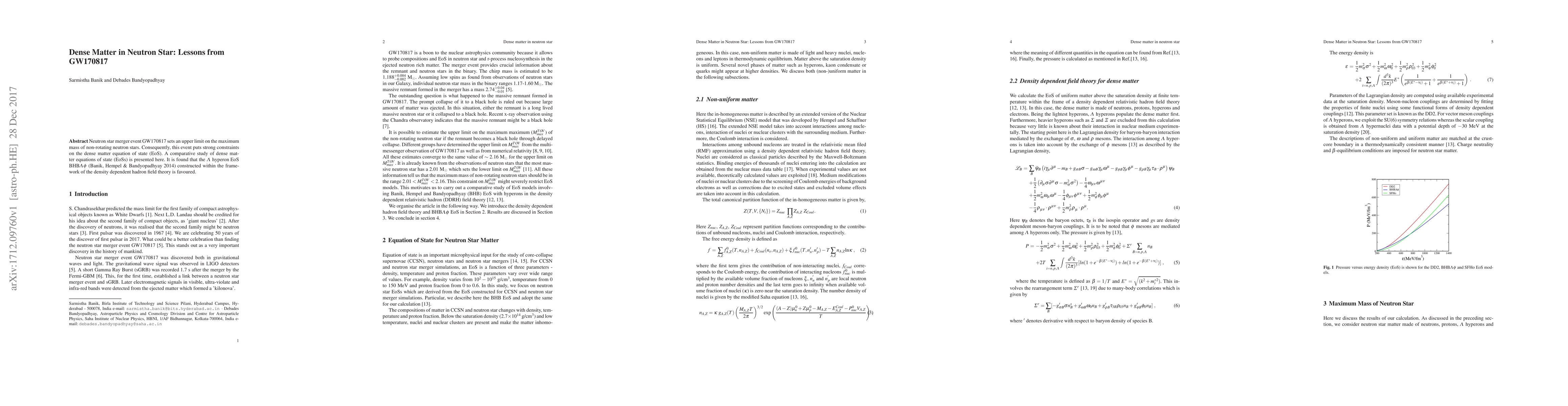 Neutron star merger event GW170817 sets an upper limit on the maximum mass of non-rotating neutron stars. Consequently, this event puts strong constraints on the dense matter equation of state (EoS). A comparative study of dense matter equations of state (EoSs) is presented here. It is found that the $\Lambda$ hyperon EoS BHB$\Lambda\phi$ (Banik, Hempel $\&$ Bandyopadhyay 2014) constructed within the framework of the density dependent hadron field theory is favoured.