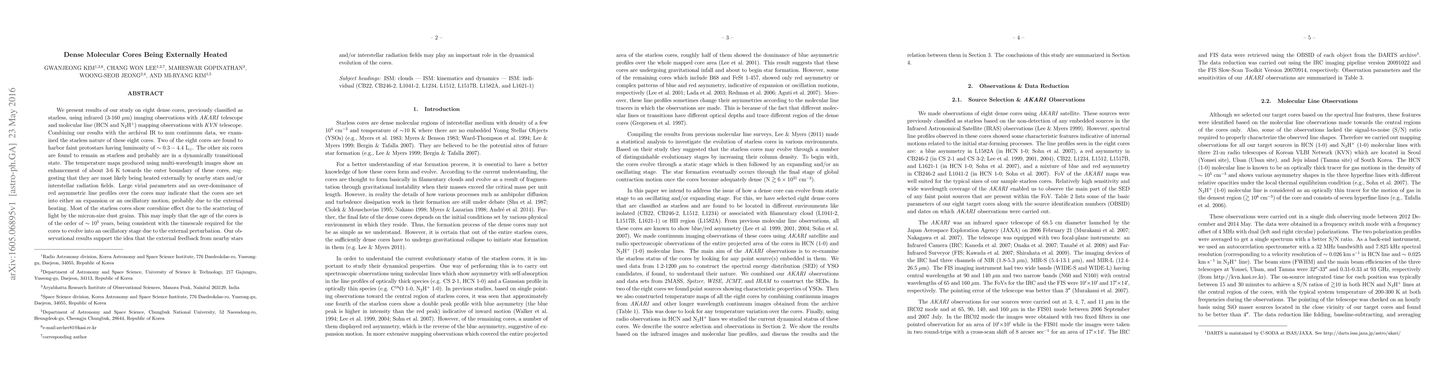 We present results of our study on eight dense cores, previously classified as starless, using infrared (3-160 {\micron}) imaging observations with \textit{AKARI} telescope and molecular line (HCN and N$_2$H$^+$) mapping observations with \textit{KVN} telescope. Combining our results with the archival IR to mm continuum data, we examined the starless nature of these eight cores. Two of the eight cores are found to harbor faint protostars having luminosity of $\sim0.3-4.4$ L$_{\odot}$. The other six cores are found to remain as starless and probably are in a dynamically transitional state. The temperature maps produced using multi-wavelength images show an enhancement of about 3-6 K towards the outer boundary of these cores, suggesting that they are most likely being heated externally by nearby stars and/or interstellar radiation fields. Large virial parameters and an over-dominance of red asymmetric line profiles over the cores may indicate that the cores are set into either an expansion or an oscillatory motion, probably due to the external heating. Most of the starless cores show coreshine effect due to the scattering of light by the micron-size dust grains. This may imply that the age of the cores is of the order of $\sim10^{5}$ years, being consistent with the timescale required for the cores to evolve into an oscillatory stage due to the external perturbation. Our observational results support the idea that the external feedback from nearby stars and/or interstellar radiation fields may play an important role in the dynamical evolution of the cores.