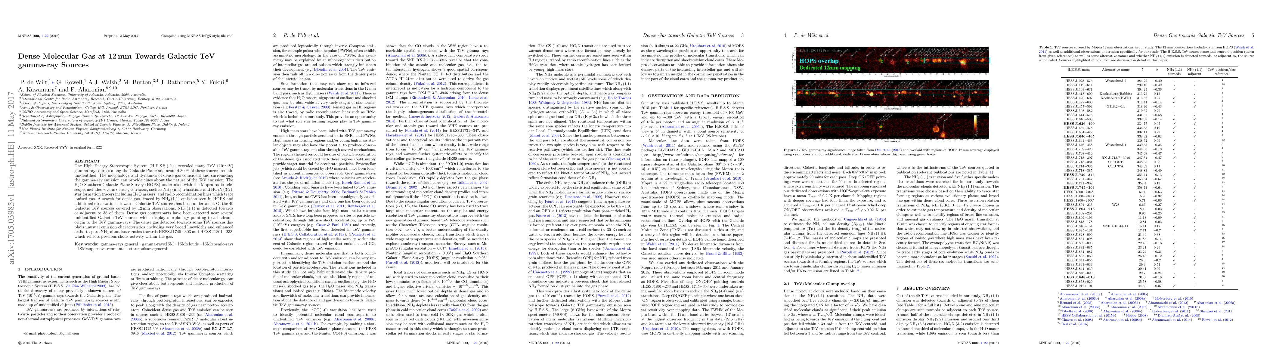 The H.E.S.S. observations identified many TeV gamma-ray sources, with dense gas traced by NH3 (1,1) emission detected near 38 of these sources. Dense gas near unidentified TeV sources suggests a hadronic origin, with unusual emission characteristics indicating past shock activity.