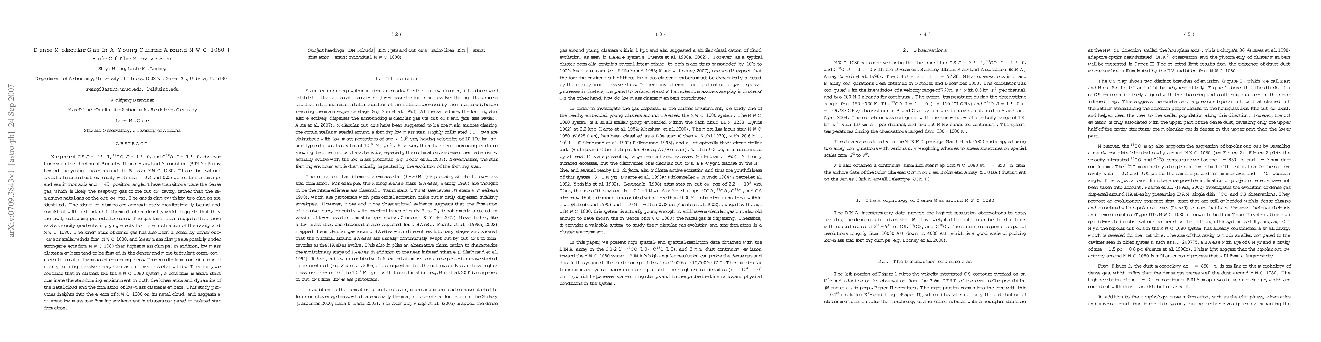The study reveals a biconical outflow cavity around the young star cluster MWC 1080 using BIMA Array observations, tracing dense gas clumps likely collapsing into protostellar cores. The research indicates massive star effects dominate the star-forming environment, influencing both the kinematics and dynamics of the natal cloud and low-mass star formation in clusters, distinct from isolated star formation.