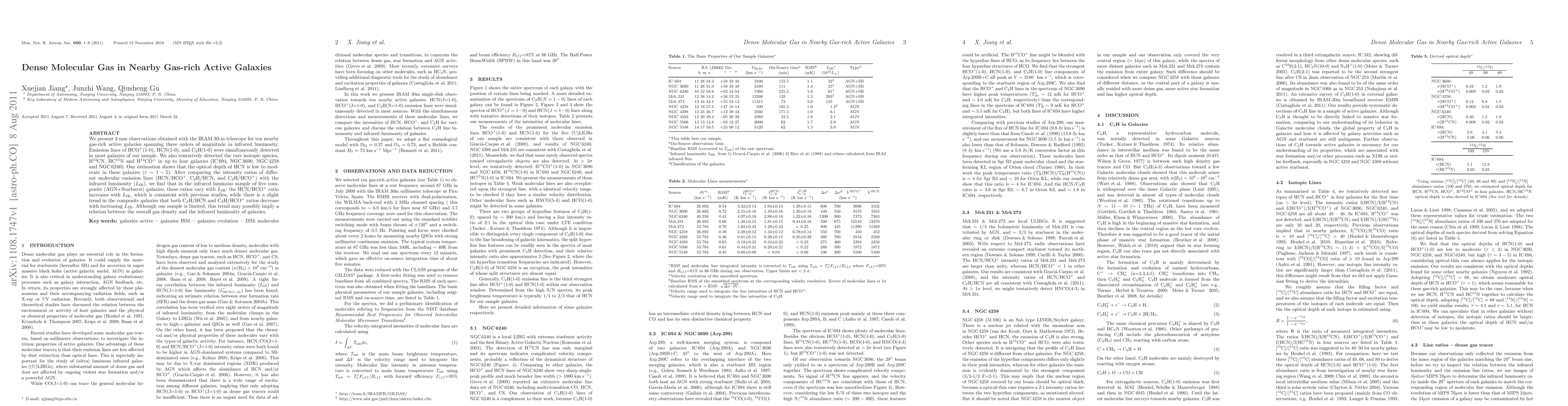The research presents 3 mm observations of ten nearby gas-rich active galaxies using the IRAM 30-m telescope, targeting emission lines of HCO+(1-0), HCN(1-0), and C2H(1-0). Isotopic species like H13CN, HC15N, and H13CO+ were tentatively detected in up to four galaxies.
