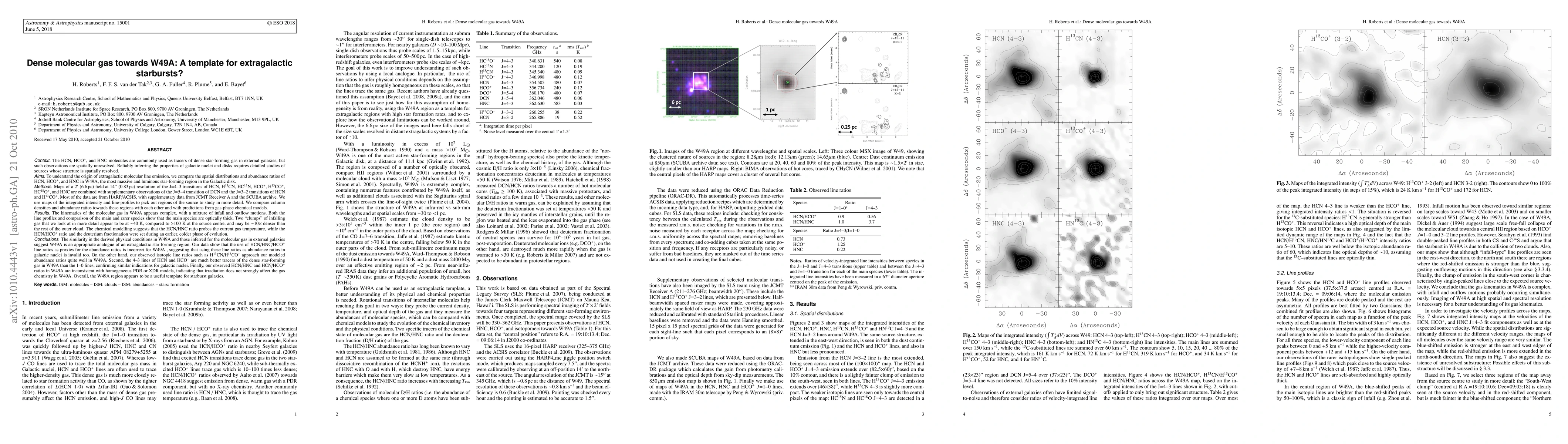 The paper investigates molecular gas in W49A, a massive star-forming region in the Galactic disk, revealing complex kinematics and challenging previous assumptions about using certain molecules to infer gas properties.