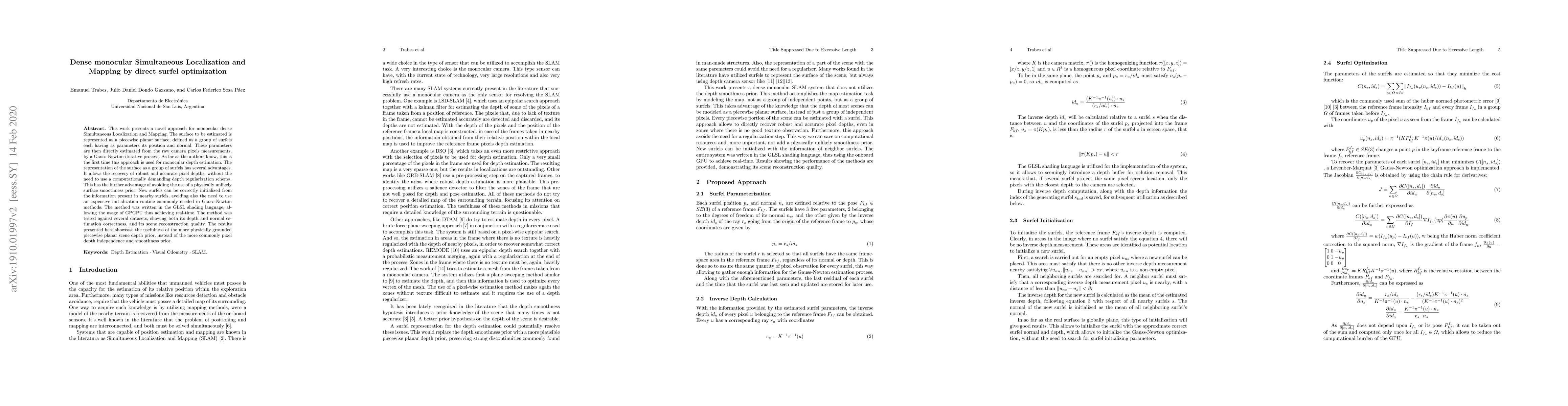 A novel approach for monocular dense Simultaneous Localization and Mapping is presented, using a piecewise planar surface represented as surfels to estimate depth and normals from raw camera pixels with real-time performance.