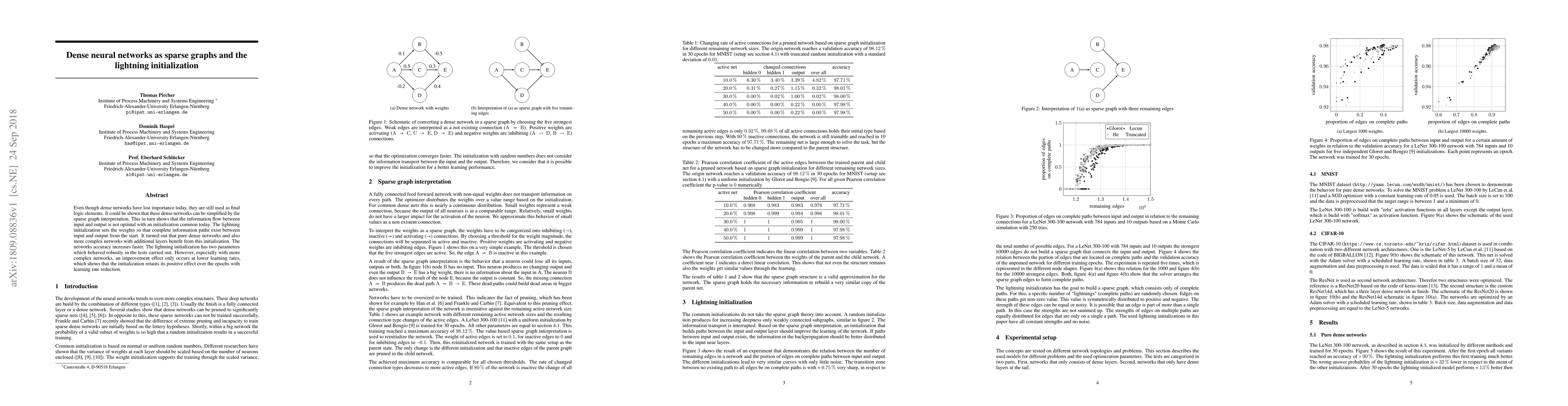 Dense neural networks can be simplified using sparse graph interpretation, which improves their accuracy when initialized with lightning initialization parameters, particularly at lower learning rates.