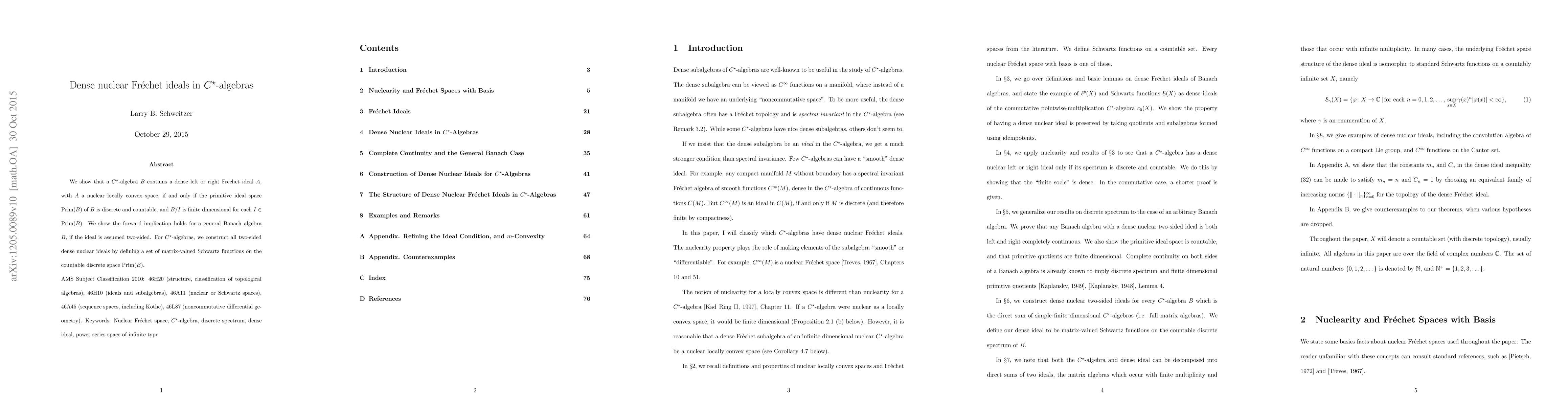 We show that a $C^\star$-algebra $B$ contains a dense left or right Fr\'echet ideal $A$, with $A$ a nuclear locally convex space, if and only if the primitive ideal space Prim$(B)$ of $B$ is discrete and countable, and $B/I$ is finite dimensional for each $I \in $ Prim$(B)$. We show the forward implication holds for a general Banach algebra $B$, if the ideal is assumed two-sided. For $C^\star$-algebras, we construct all two-sided dense nuclear ideals by defining a set of matrix-valued Schwartz functions on the countable discrete space Prim$(B)$.