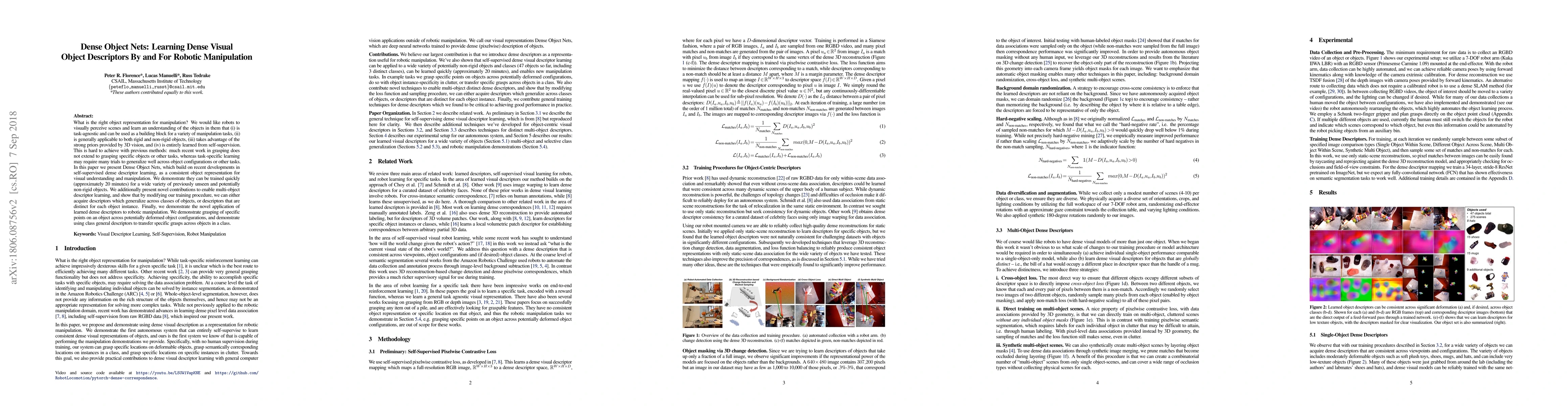 Dense Object Nets provide a self-supervised, task-agnostic dense visual representation for robotic manipulation that generalizes across rigid and non-rigid objects. They enable efficient training and transfer learning for grasping specific points and generalizing grasps across object classes.