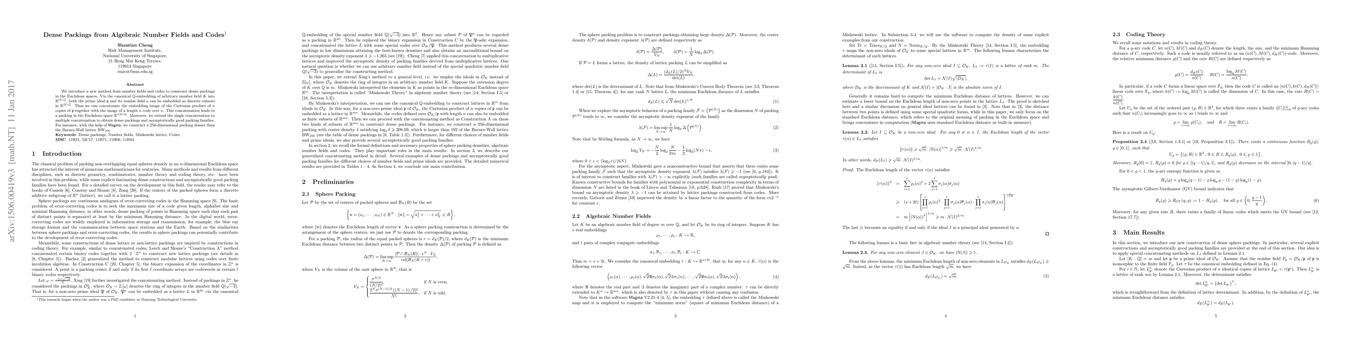A novel approach combining lattice theory and coding theory to construct dense packing families from quadratic fields.