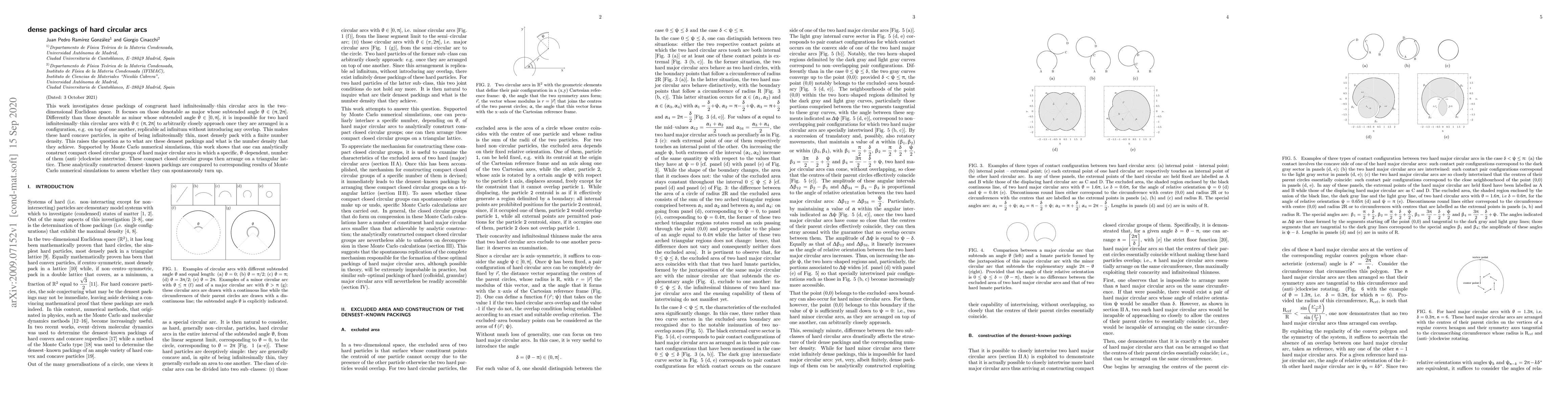 This work investigates dense packings of congruent hard infinitesimally--thin circular arcs in the two-dimensional Euclidean space. It focuses on those denotable as major whose subtended angle $\theta \in \left ( \pi, 2\pi \right ]$. Differently than those denotable as minor whose subtended angle $\theta \in \left [0, \pi \right]$, it is impossible for two hard infinitesimally-thin circular arcs with $\theta \in \left ( \pi, 2\pi \right ]$ to arbitrarily closely approach once they are arranged in a configuration, e.g. on top of one another, replicable ad infinitum without introducing any overlap. This makes these hard concave particles, in spite of being infinitesimally thin, most densely pack with a finite number density. This raises the question as to what are these densest packings and what is the number density that they achieve. Supported by Monte Carlo numerical simulations, this work shows that one can analytically construct compact closed circular groups of hard major circular arcs in which a specific, $\theta$-dependent, number of them (anti-)clockwise intertwine. These compact closed circular groups then arrange on a triangular lattice. These analytically constructed densest-known packings are compared to corresponding results of Monte Carlo numerical simulations to assess whether they can spontaneously turn up.