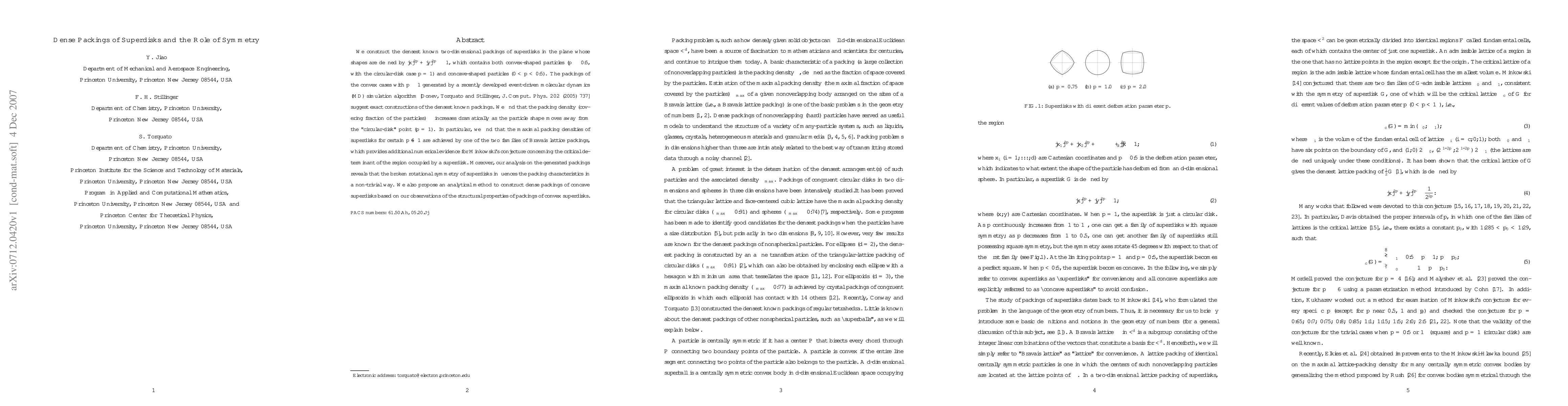 This paper constructs dense packings of superdisks in two dimensions, exploring both convex and concave shapes, and finds that packing density increases significantly as shapes deviate from circular disks. The study reveals that maximal packing densities for certain shapes are achieved through specific lattice structures, supporting Minkowski's conjecture, and highlights the influence of broken rotational symmetry on packing characteristics.