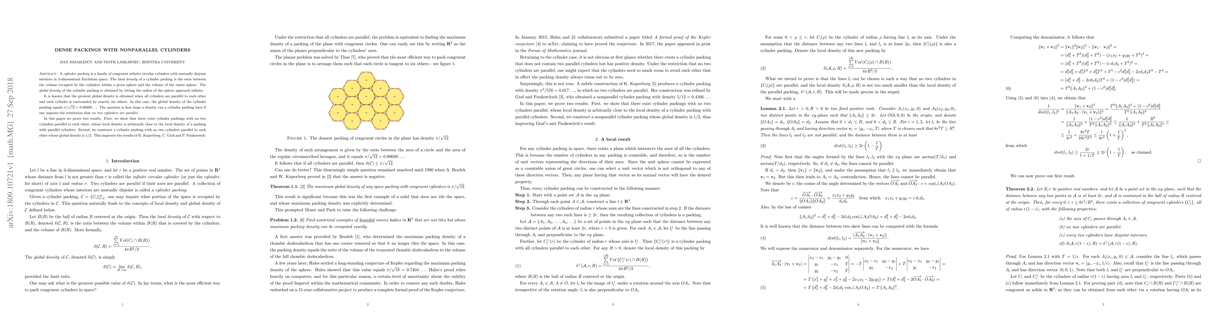 A \emph{cylinder packing} is a family of congruent infinite circular cylinders with mutually disjoint interiors in $3$-dimensional Euclidean space. The \emph{local density} of a cylinder packing is the ratio between the volume occupied by the cylinders within a given sphere and the volume of the entire sphere. The \emph{global density} of the cylinder packing is obtained by letting the radius of the sphere approach infinity. It is known that the greatest global density is obtained when all cylinders are parallel to each other and each cylinder is surrounded by exactly six others. In this case, the global density of the cylinder packing equals $\pi/\sqrt{12}= 0.90689\ldots$. The question is how large a density can a cylinder packing have if one imposes the restriction that \emph{no two cylinders are parallel}. In this paper we prove two results. First, we show that there exist cylinder packings with no two cylinders parallel to each other, whose local density is arbitrarily close to the local density of a packing with parallel cylinders. Second, we construct a cylinder packing with no two cylinders parallel to each other whose global density is $1/2$. This improves the results of K. Kuperberg, C. Graf and P. Paukowisch.