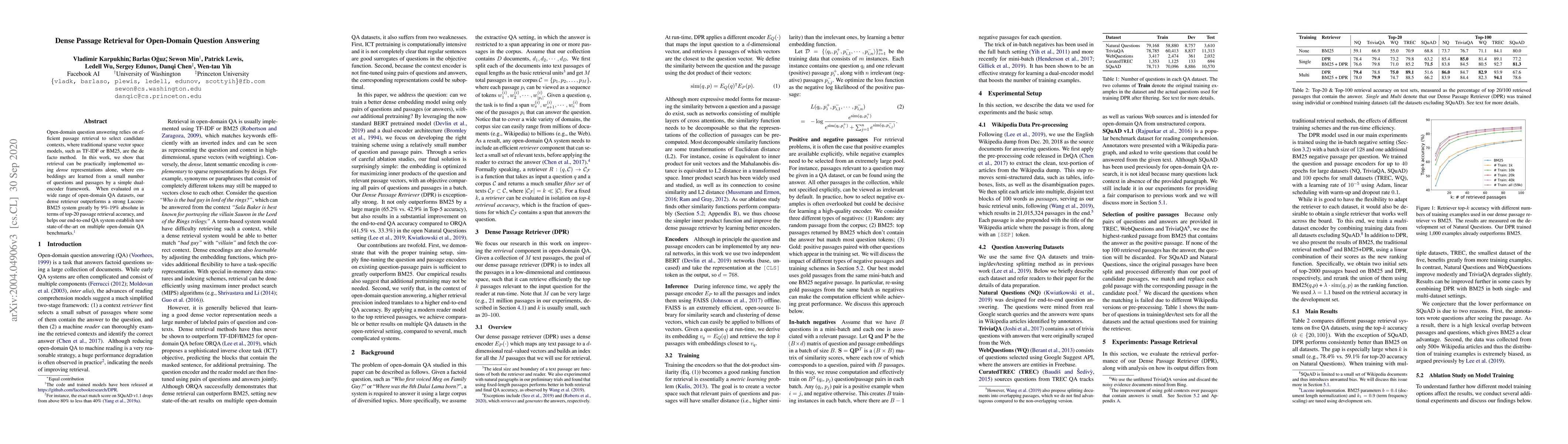 Open-domain question answering relies on efficient passage retrieval to select candidate contexts, where traditional sparse vector space models, such as TF-IDF or BM25, are the de facto method. In this work, we show that retrieval can be practically implemented using dense representations alone, where embeddings are learned from a small number of questions and passages by a simple dual-encoder framework. When evaluated on a wide range of open-domain QA datasets, our dense retriever outperforms a strong Lucene-BM25 system largely by 9%-19% absolute in terms of top-20 passage retrieval accuracy, and helps our end-to-end QA system establish new state-of-the-art on multiple open-domain QA benchmarks.