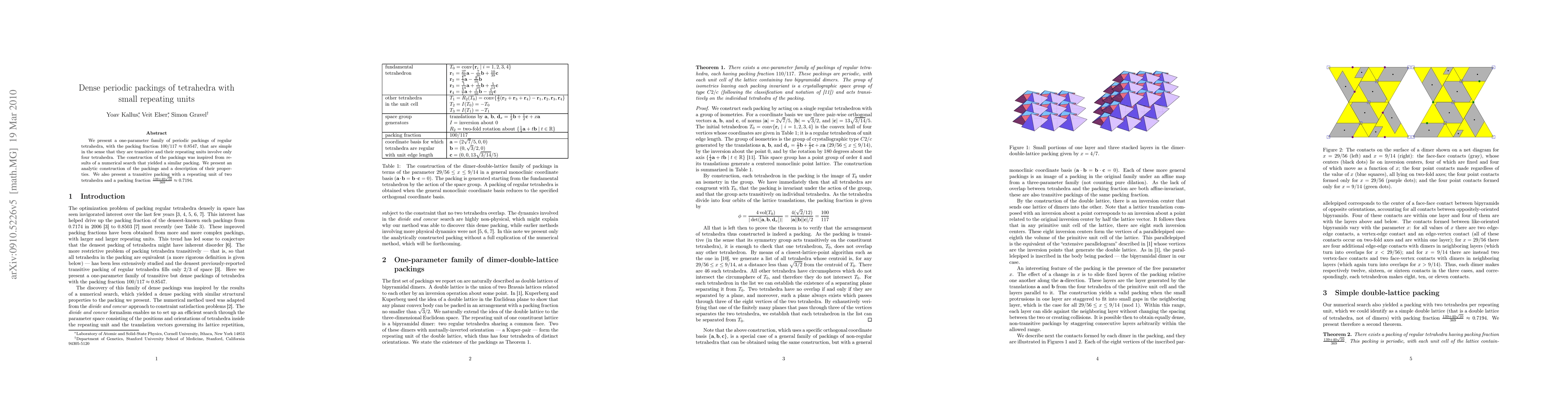 This paper presents a one-parameter family of periodic packings of regular tetrahedra with a high packing fraction of approximately 0.8547, featuring simple repeating units of four tetrahedra. It also introduces an analytic construction method for these packings and includes a transitive packing with a smaller repeating unit of two tetrahedra and a packing fraction of approximately 0.7194.