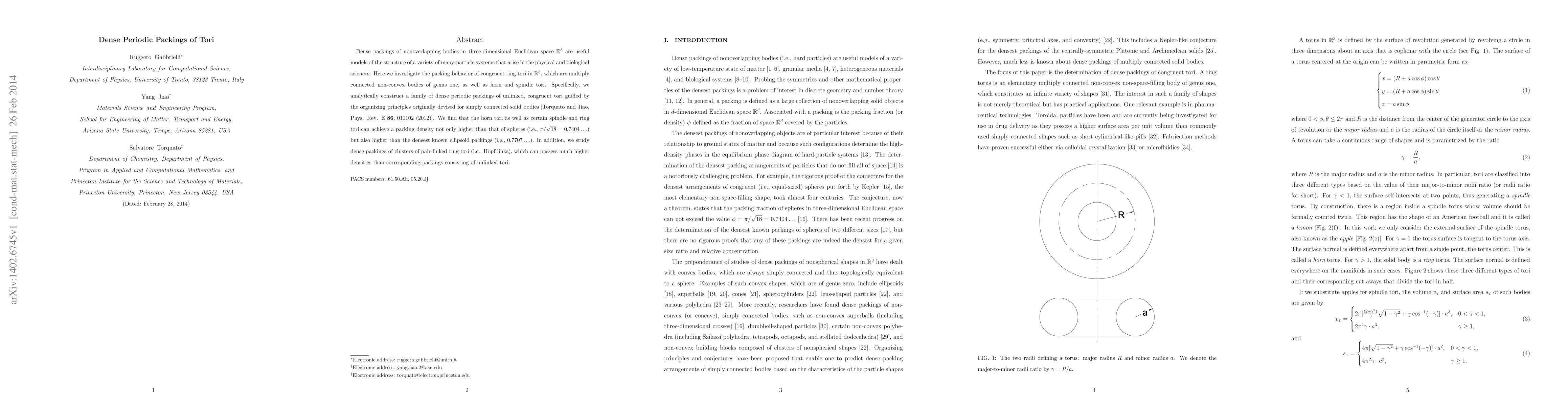 This paper investigates dense periodic packings of various types of tori, including ring, horn, and spindle tori, and explores their packing density. The authors construct dense packings analytically and find that horn tori and certain spindle and ring tori can achieve packing densities higher than those of spheres and ellipsoids, highlighting the potential of these nonconvex bodies in many-particle systems.