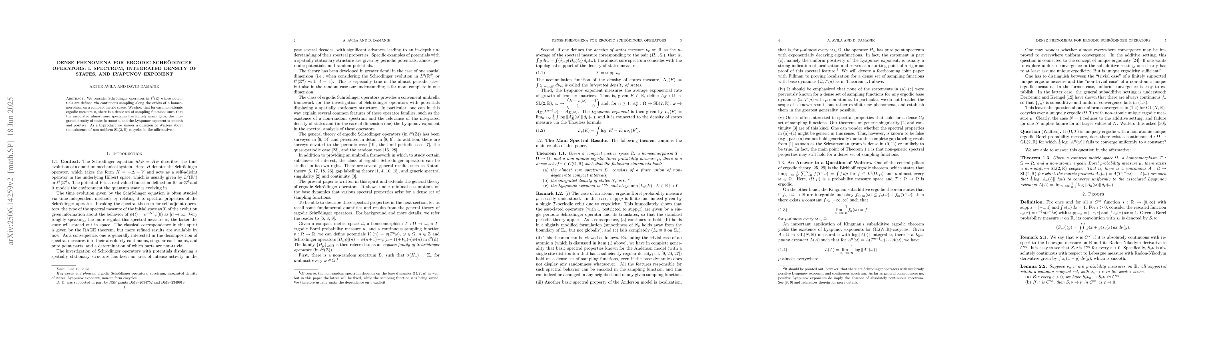 We consider Schr\"odinger operators in $\ell^2(\Z)$ whose potentials are defined via continuous sampling along the orbits of a homeomorphism on a compact metric space. We show that for each non-atomic ergodic measure $\mu$, there is a dense set of sampling functions such that the associated almost sure spectrum has finitely many gaps, the integrated density of states is smooth, and the Lyapunov exponent is smooth and positive. As a byproduct we answer a question of Walters about the existence of non-uniform $\SL(2,\R)$ cocycles in the affirmative.