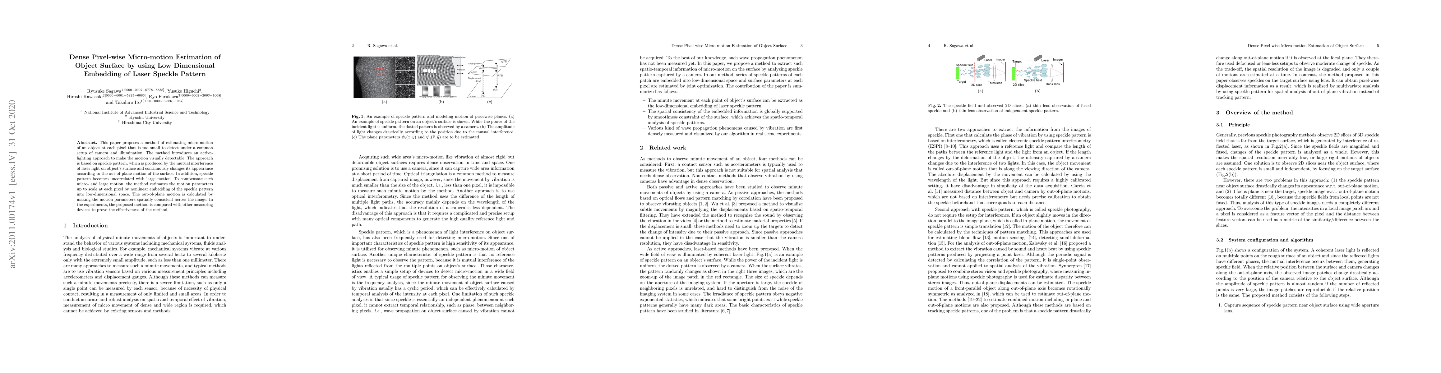 This paper proposes a method of estimating micro-motion of an object at each pixel that is too small to detect under a common setup of camera and illumination. The method introduces an active-lighting approach to make the motion visually detectable. The approach is based on speckle pattern, which is produced by the mutual interference of laser light on object's surface and continuously changes its appearance according to the out-of-plane motion of the surface. In addition, speckle pattern becomes uncorrelated with large motion. To compensate such micro- and large motion, the method estimates the motion parameters up to scale at each pixel by nonlinear embedding of the speckle pattern into low-dimensional space. The out-of-plane motion is calculated by making the motion parameters spatially consistent across the image. In the experiments, the proposed method is compared with other measuring devices to prove the effectiveness of the method.