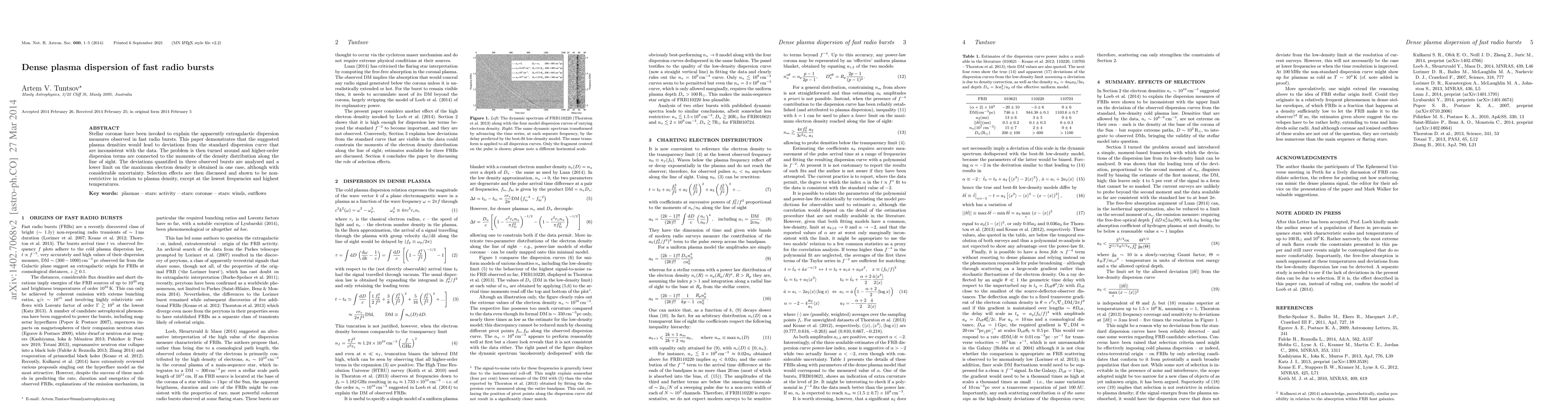 This paper argues that stellar coronae cannot explain the dispersion of fast radio bursts due to inconsistent plasma densities, and instead proposes a method to connect higher-order dispersion terms to the density distribution along the line of sight, finding a lower limit on maximum electron density with significant uncertainty. Selection effects are shown to be non-restrictive except at low frequencies and high temperatures.