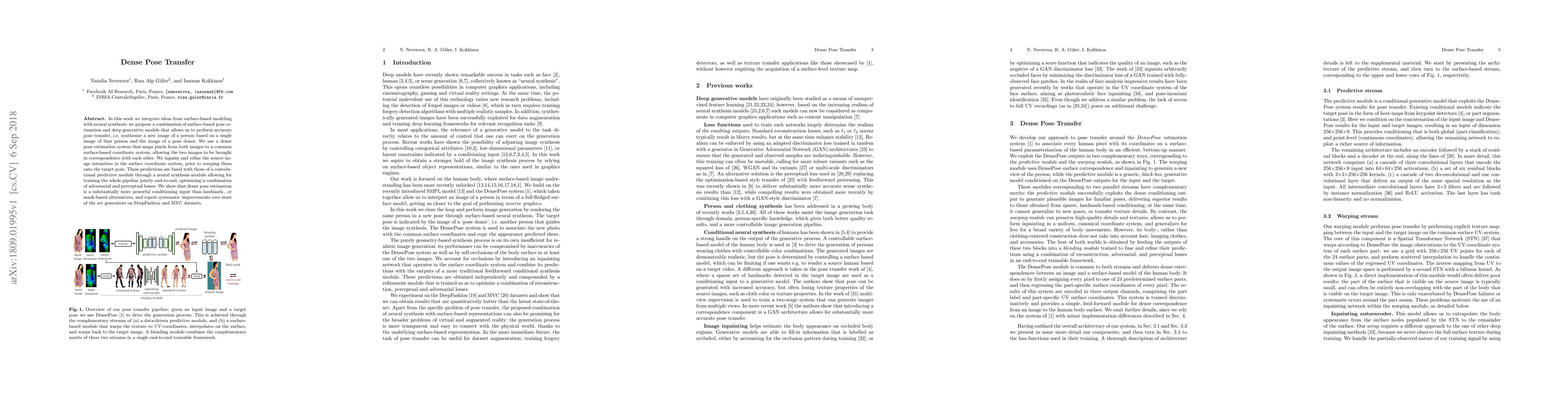 This paper proposes a method combining surface-based pose estimation with deep generative models for accurate pose transfer, achieving better results than existing approaches using dense pose estimation instead of landmarks or masks. The method optimizes a joint end-to-end pipeline with adversarial and perceptual losses, showing improvements on DeepFashion and MVC datasets.