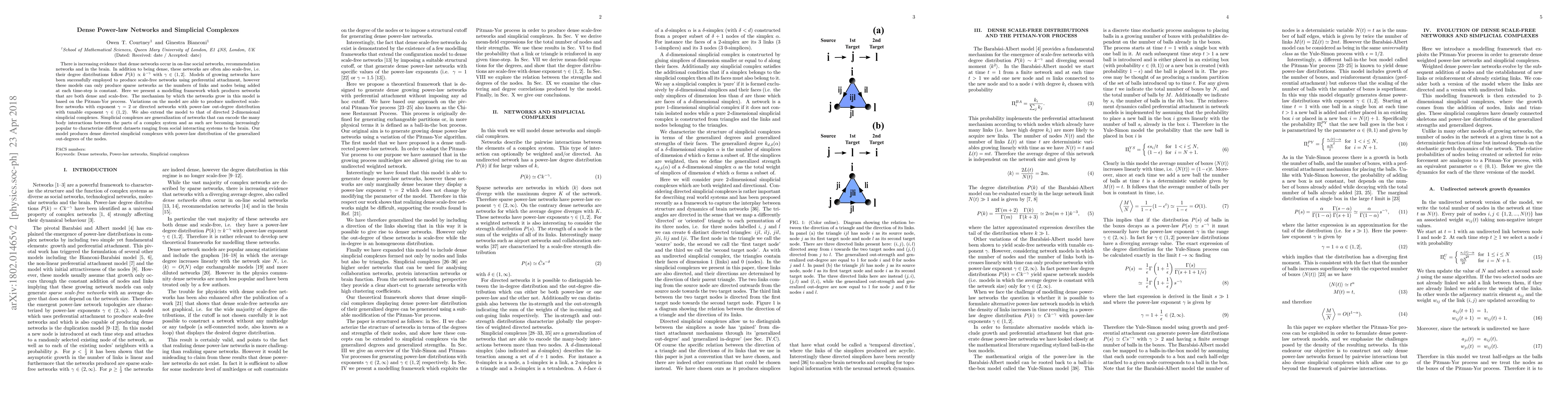 There is increasing evidence that dense networks occur in on-line social networks, recommendation networks and in the brain. In addition to being dense, these networks are often also scale-free, i.e. their degree distributions follow $P(k)\propto k^{-\gamma}$ with $\gamma\in(1,2]$. Models of growing networks have been successfully employed to produce scale-free networks using preferential attachment, however these models can only produce sparse networks as the numbers of links and nodes being added at each time-step is constant. Here we present a modelling framework which produces networks that are both dense and scale-free. The mechanism by which the networks grow in this model is based on the Pitman-Yor process. Variations on the model are able to produce undirected scale-free networks with exponent $\gamma=2$ or directed networks with power-law out-degree distribution with tunable exponent $\gamma \in (1,2)$. We also extend the model to that of directed $2$-dimensional simplicial complexes. Simplicial complexes are generalization of networks that can encode the many body interactions between the parts of a complex system and as such are becoming increasingly popular to characterize different data sets ranging from social interacting systems to the brain. Our model produces dense directed simplicial complexes with power-law distribution of the generalized out-degrees of the nodes.
